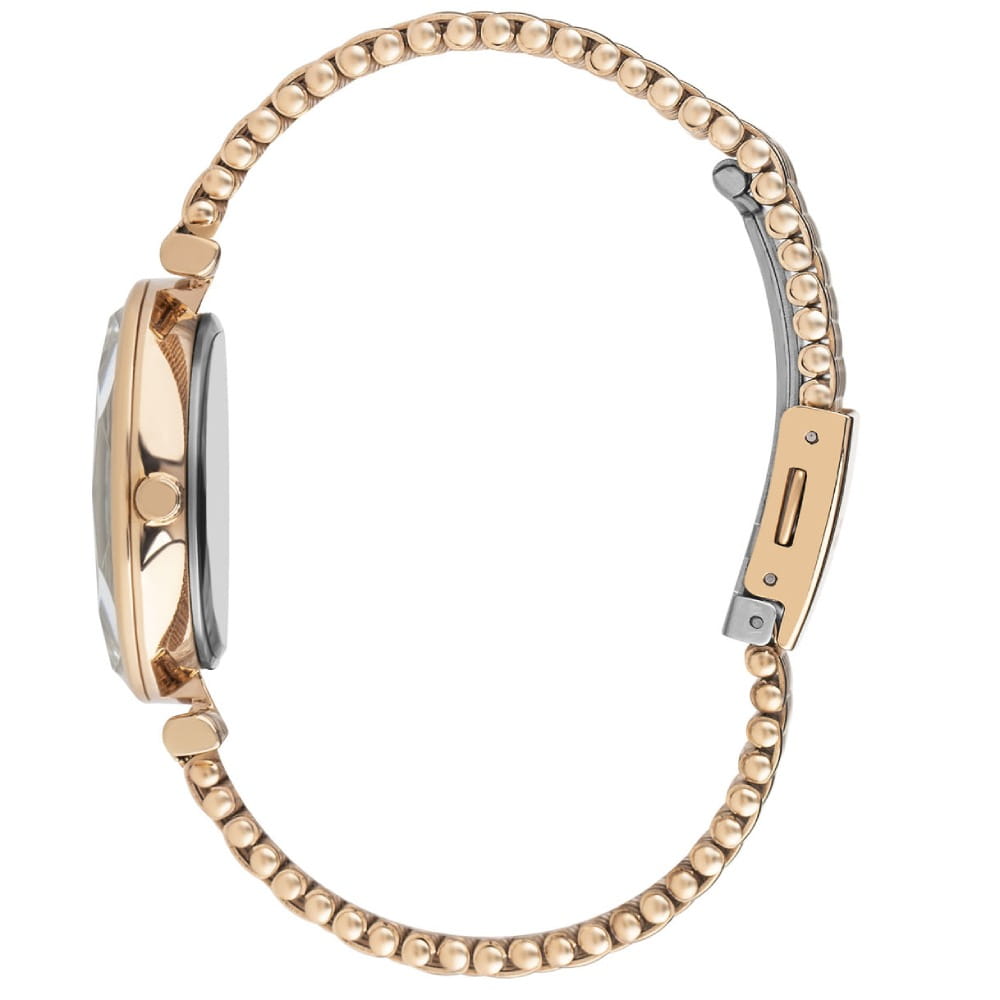 Женские наручные часы Lee Cooper LC07410.130 — это элегантная модель с утончённым дизайном. Корпус диаметром 33 мм выполнен из нержавеющей стали с IP-покрытиемIP-покрытиеМетод ионного напыления. Демонстрирует повышенную устойчивость к истиранию, окислению и химическим веществам. Под воздействием высокого давления и температуры около 1500°C молекулы металла надёжно соединяются с частицами корпуса часов., что придаёт часам изысканный вид. Перламутровый циферблат украшен изящными метками из кристаллов и стрелками, обеспечивая удобное считывание времени. Циферблат защищён минеральным стекломМинеральное стеклоМинеральное стекло представляет собой искусственно выращенный минерал кварца. Такое стекло отличается особой устойчивостью к повреждениям и царапинам. Уступает по некоторым качествам сапфировому стеклу., устойчивым к царапинам. Часы работают на кварцевом механизме, обеспечивая точность хода. Браслет из нержавеющей стали с раскладной застёжкойРаскладная застёжкаТакой тип застёжки используется только на браслетах из металла. Она никогда не раскрывается полностью, происходит разделение на 2 и более частей. Раскладывающая застёжка снизит вероятность потери часов к минимуму. гарантирует комфортное ношение и надёжную фиксацию на запястье. Водозащита 30 метров защищает часы от случайных брызг и дождя, делая их подходящими для повседневного использования.