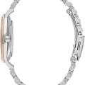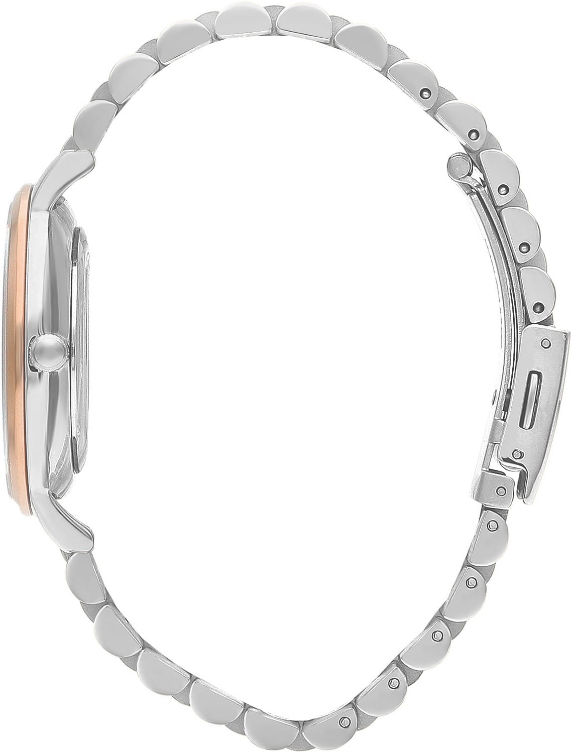 Женские часы Lee Cooper LC07548.520 — это стильное сочетание элегантности и современного дизайна. Круглый корпус диаметром 36 мм выполнен из суперметалла серебристого цвета. Неподвижный безельБезельВнешний ободок, закрепляющий стекло. В спортивных часах так называется поворотное кольцо с делениями на циферблате, выполняет роль таймера – замеряет отрезки времени на шкале. Неподвижный безель – элемент декора. Однонаправленно вращающийся безель на дайверских часах позволяет фиксировать моменты погружения и выныривания на поверхность. с IP-покрытиемIP-покрытиеМетод ионного напыления. Демонстрирует повышенную устойчивость к истиранию, окислению и химическим веществам. Под воздействием высокого давления и температуры около 1500°C молекулы металла надёжно соединяются с частицами корпуса часов. цвета розового золота, что придает модели особый блеск. Серебристый циферблат защищен минеральным стекломМинеральное стеклоМинеральное стекло представляет собой искусственно выращенный минерал кварца. Такое стекло отличается особой устойчивостью к повреждениям и царапинам. Уступает по некоторым качествам сапфировому стеклу., обеспечивающим устойчивость к царапинам и украшен цирконами в виде меток. Часы оснащены надежным кварцевым механизмом, а металлический браслет с частичным IP-покрытиемIP-покрытиеМетод ионного напыления. Демонстрирует повышенную устойчивость к истиранию, окислению и химическим веществам. Под воздействием высокого давления и температуры около 1500°C молекулы металла надёжно соединяются с частицами корпуса часов. на раскладной застёжкеРаскладная застёжкаТакой тип застёжки используется только на браслетах из металла. Она никогда не раскрывается полностью, происходит разделение на 2 и более частей. Раскладывающая застёжка снизит вероятность потери часов к минимуму. гарантирует комфортную посадку на запястье. Водозащита 30 метров защищает модель от случайных брызг и дождя. Lee Cooper  — отличный выбор для тех, кто ценит утонченность и качество.