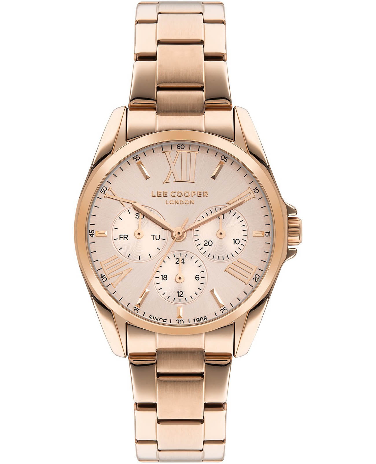 Женские часы Lee Cooper LC07685.410 — это стильное сочетание элегантности и современного дизайна. Круглый корпус диаметром 36 мм выполнен из суперметалла с IP-покрытиемIP-покрытиеМетод ионного напыления. Демонстрирует повышенную устойчивость к истиранию, окислению и химическим веществам. Под воздействием высокого давления и температуры около 1500°C молекулы металла надёжно соединяются с частицами корпуса часов., придающий модели особый блеск. Золотисто-розовый циферблат с золотыми индексами защищен минеральным стекломМинеральное стеклоМинеральное стекло представляет собой искусственно выращенный минерал кварца. Такое стекло отличается особой устойчивостью к повреждениям и царапинам. Уступает по некоторым качествам сапфировому стеклу., обеспечивающим устойчивость к царапинам. Часы оснащены надежным кварцевым механизмом, а стальной браслет с IP-покрытиемIP-покрытиеМетод ионного напыления. Демонстрирует повышенную устойчивость к истиранию, окислению и химическим веществам. Под воздействием высокого давления и температуры около 1500°C молекулы металла надёжно соединяются с частицами корпуса часов. на раскладной застёжкеРаскладная застёжкаТакой тип застёжки используется только на браслетах из металла. Она никогда не раскрывается полностью, происходит разделение на 2 и более частей. Раскладывающая застёжка снизит вероятность потери часов к минимуму. гарантирует комфортную посадку на запястье. Мультифункциональная модель с индикацией даты, дня недели, с дополнительным 24-х часовым индикатором.  Водозащита 30 метров защищает модель от случайных брызг и дождя. Lee Cooper  — это идеальный выбор для тех, кто ценит классический стиль, точность механизма и качество материалов в одном аксессуаре.