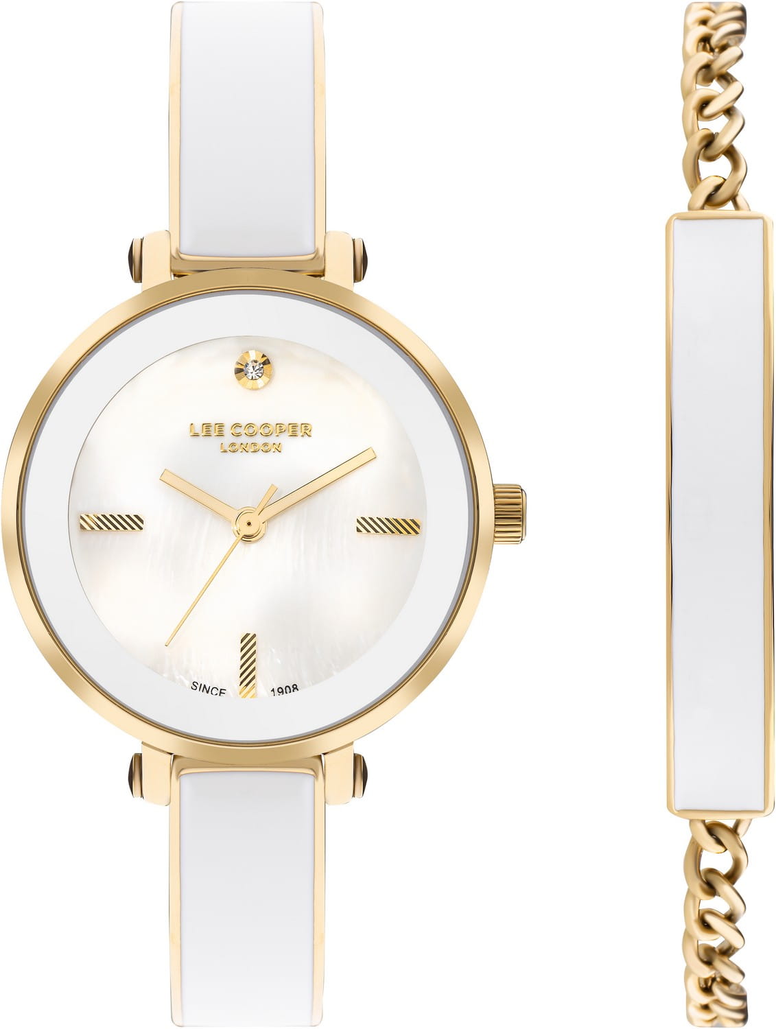 Женские часы Lee Cooper LC07813.120 выполнены в классическом стиле и сочетают строгий дизайн с надёжным механизмом. Модель оснащена кварцевым механизмом , обеспечивающим точность хода и минимальное обслуживание. Корпус круглой формы имеет размер 32 мм, изготовлен из суперметалла с IP-покрытиемIP-покрытиеМетод ионного напыления. Демонстрирует повышенную устойчивость к истиранию, окислению и химическим веществам. Под воздействием высокого давления и температуры около 1500°C молекулы металла надёжно соединяются с частицами корпуса часов., гарантирует комфорт при ношении. Циферблат перламутрового цвета дополнен индексами для чёткого отсчёта времени. Защиту циферблата обеспечивает минеральное стеклоМинеральное стеклоМинеральное стекло представляет собой искусственно выращенный минерал кварца. Такое стекло отличается особой устойчивостью к повреждениям и царапинам. Уступает по некоторым качествам сапфировому стеклу., устойчивое к мелким механическим повреждениям. Изысканный стальной браслет с керамическими вставками с IP-покрытиемIP-покрытиеМетод ионного напыления. Демонстрирует повышенную устойчивость к истиранию, окислению и химическим веществам. Под воздействием высокого давления и температуры около 1500°C молекулы металла надёжно соединяются с частицами корпуса часов. на раскладной застёжкеРаскладная застёжкаТакой тип застёжки используется только на браслетах из металла. Она никогда не раскрывается полностью, происходит разделение на 2 и более частей. Раскладывающая застёжка снизит вероятность потери часов к минимуму. гарантирует комфортную посадку на запястье. Водозащита 3 АТМ позволяет использовать часы в повседневных условиях без риска повреждения от случайных брызг воды. В комплекте к часам идет дополнительный браслет в цвет часов. Это сочетание классического дизайна, прочности материалов и качества исполнения для уверенных в себе женщин.