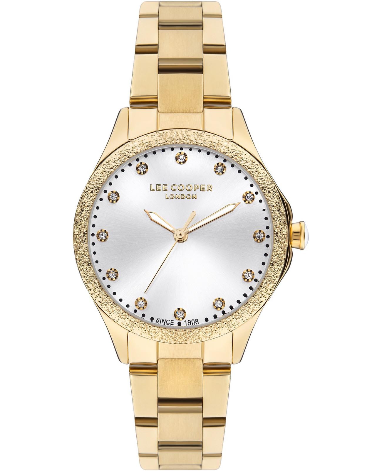 Женские наручные часы Lee Cooper LC07840.130 — это элегантная модель с утончённым дизайном. Корпус диаметром 35 мм выполнен из суперметалла с IP-покрытиемIP-покрытиеМетод ионного напыления. Демонстрирует повышенную устойчивость к истиранию, окислению и химическим веществам. Под воздействием высокого давления и температуры около 1500°C молекулы металла надёжно соединяются с частицами корпуса часов., что придаёт часам изысканный вид. Серебристый циферблат украшен изящными вставками из циркония в виде меток времени и стрелками, обеспечивая удобное считывание времени. Циферблат защищён минеральным стекломМинеральное стеклоМинеральное стекло представляет собой искусственно выращенный минерал кварца. Такое стекло отличается особой устойчивостью к повреждениям и царапинам. Уступает по некоторым качествам сапфировому стеклу., устойчивым к царапинам. Часы работают на кварцевом механизме, обеспечивая точность хода. Часовая и минутная стрелки с люминесцентным покрытиемЛюминесцентное покрытиеПозволяет считывать показания времени в темноте. Производители наносят на стрелки, часовые индексы, безель или поверхность циферблата светонакопительный состав, дающий холодное свечение.. Браслет из нержавеющей стали с IP-покрытиемIP-покрытиеМетод ионного напыления. Демонстрирует повышенную устойчивость к истиранию, окислению и химическим веществам. Под воздействием высокого давления и температуры около 1500°C молекулы металла надёжно соединяются с частицами корпуса часов. с раскладной застёжкойРаскладная застёжкаТакой тип застёжки используется только на браслетах из металла. Она никогда не раскрывается полностью, происходит разделение на 2 и более частей. Раскладывающая застёжка снизит вероятность потери часов к минимуму. гарантирует комфортное ношение и надёжную фиксацию на запястье. Водозащита 30 метров защищает часы от случайных брызг и дождя, делая их подходящими для повседневного использования.