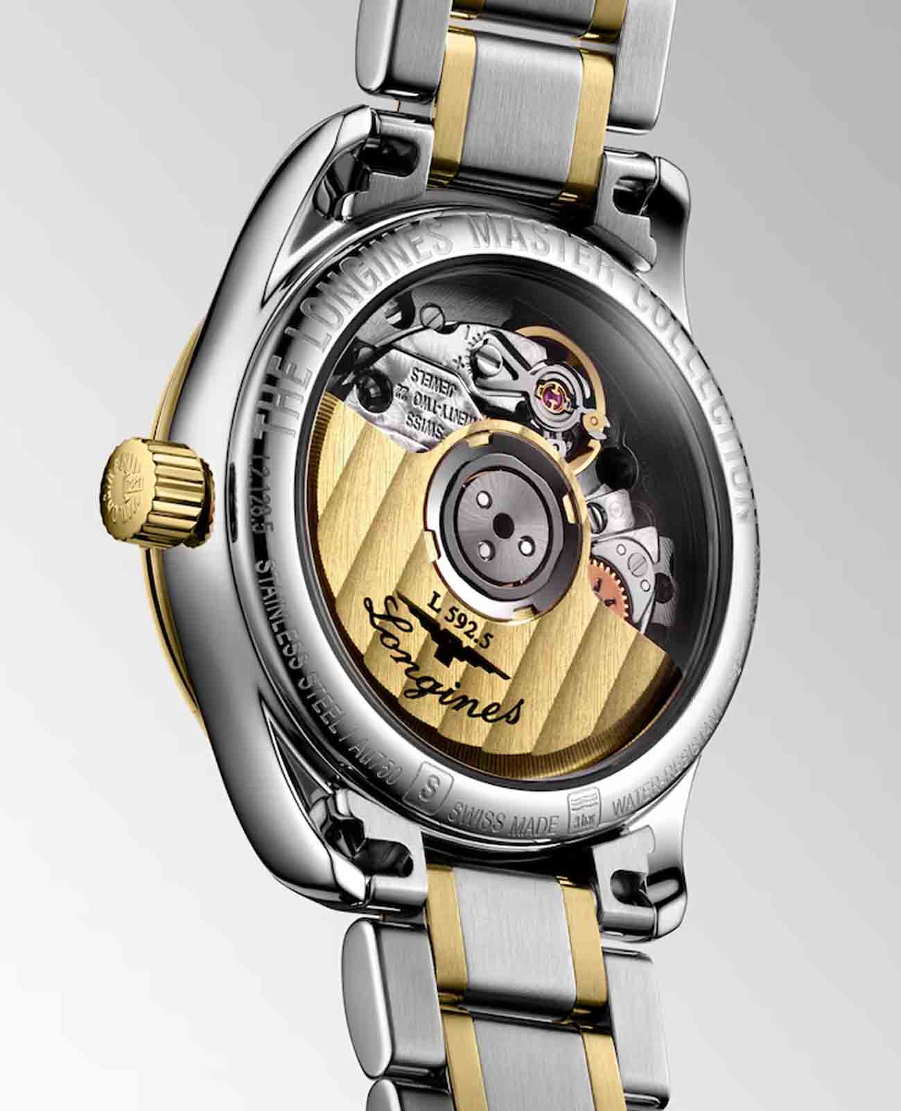 Корпус часов выполнен из комбинации нержавеющей стали и 18-каратного золота18-каратное золотоОбозначение по каратной системе пробирования, оно показывает, сколько драгоценного металла содержится в изделии. 18 карат - в составе 75% чистого золота, соответствует 750 пробе.