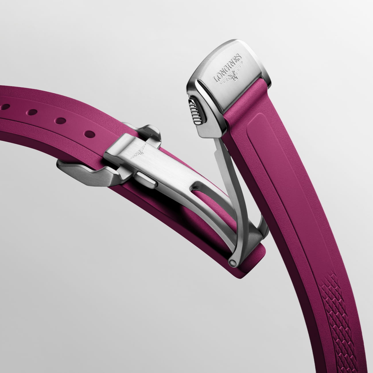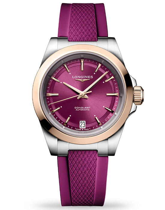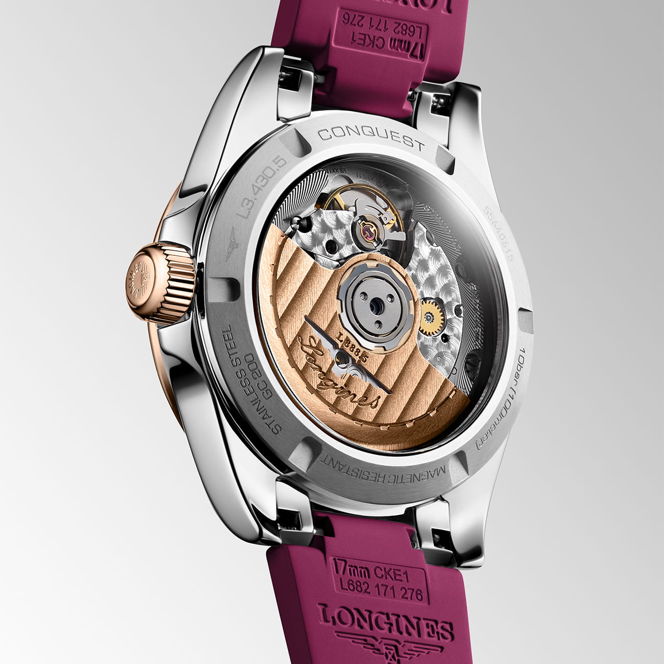 Женские швейцарские механические часы с автоподзаводом Longines Conquest L3.430.5.98.9. Сапфировое стеклоСапфировое стеклоПрочный и надёжный материал из кристалла сапфира синтетического происхождения, характеризующийся особой твёрдостью и устойчивостью к царапинам и повреждениям. устойчивое к появлению царапин, обладающее высокой прозрачностью. Корпус часов изготовлен из нержавеющей стали. Циферблат выполнен по технологии Sunray (солнечные лучи). Стрелки с люминесцентным покрытиемЛюминесцентное покрытиеПозволяет считывать показания времени в темноте. Производители наносят на стрелки, часовые индексы, безель или поверхность циферблата светонакопительный состав, дающий холодное свечение.. Окошко даты в положении 6 часов. Прозрачная задняя крышка. Класс водозащиты: 100 метров, позволит плавать, нырять и заниматься другими водными видами спорта. Каучуковый браслет на раскладной застёжкеРаскладная застёжкаТакой тип застёжки используется только на браслетах из металла. Она никогда не раскрывается полностью, происходит разделение на 2 и более частей. Раскладывающая застёжка снизит вероятность потери часов к минимуму.. БезельБезельВнешний ободок, закрепляющий стекло. В спортивных часах так называется поворотное кольцо с делениями на циферблате, выполняет роль таймера – замеряет отрезки времени на шкале. Неподвижный безель – элемент декора. Однонаправленно вращающийся безель на дайверских часах позволяет фиксировать моменты погружения и выныривания на поверхность. из стали с 18-каратным золотом18-каратное золотоОбозначение по каратной системе пробирования, оно показывает, сколько драгоценного металла содержится в изделии. 18 карат - в составе 75% чистого золота, соответствует 750 пробе.