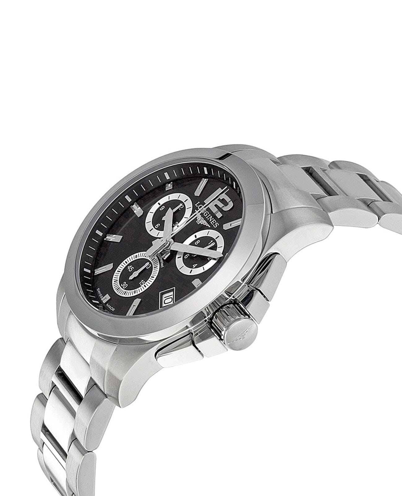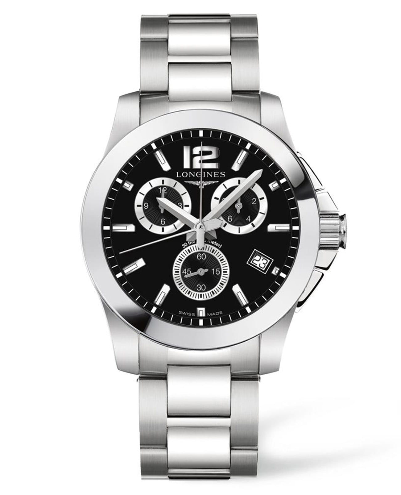 Мужские швейцарские механические часы-хронографХронографФункция позволяет измерять отрезки времени с особой точностью: часы, минуты, секунды. Верным признаком хронографа является наличие на циферблате 3 дополнительных окошек-счётчиков. с автоподзаводом Longines Conquest L3.660.4.56.6. Сапфировое стеклоСапфировое стеклоПрочный и надёжный материал из кристалла сапфира синтетического происхождения, характеризующийся особой твёрдостью и устойчивостью к царапинам и повреждениям. устойчивое к появлению царапин, обладающее высокой прозрачностью. Корпус часов изготовлен из нержавеющей стали. На циферблате расположены три дополнительных индикатора и окошко даты. Окошко даты в положении 4 часов. Класс водозащиты: 300 метров, позволит плавать, нырять и заниматься другими водными видами спорта. Стальной браслет на застёжке «бабочка» с кнопкамиЗастёжка "бабочка"Такой вид застёжки дополняется предохранителями, помогающими избежать случайного раскрытия браслета. Обладают изящным исполнением. .