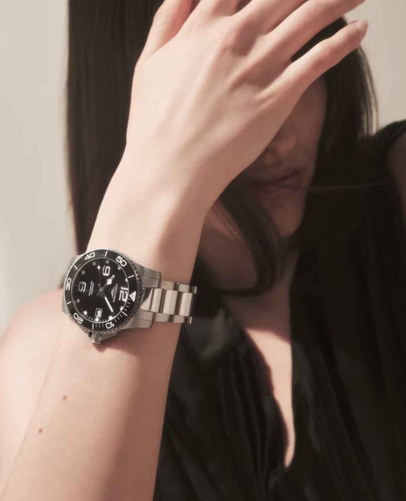 Швейцарские механические часы для дайвинга Longines HydroConquest L3.780.4.56.6. Сапфировое стеклоСапфировое стеклоПрочный и надёжный материал из кристалла сапфира синтетического происхождения, характеризующийся особой твёрдостью и устойчивостью к царапинам и повреждениям. с многослойным антибликовым покрытием с обеих сторон, устойчивое к появлению царапин, обладающее высокой прозрачностью. Корпус часов изготовлен из стали. Вращающийся безельБезельВнешний ободок, закрепляющий стекло. В спортивных часах так называется поворотное кольцо с делениями на циферблате, выполняет роль таймера – замеряет отрезки времени на шкале. Неподвижный безель – элемент декора. Однонаправленно вращающийся безель на дайверских часах позволяет фиксировать моменты погружения и выныривания на поверхность. из стали и керамики, защищенный от царапин, никогда не изнашивается и не выцветает. Стрелки и метки с люминесцентным покрытиемЛюминесцентное покрытиеПозволяет считывать показания времени в темноте. Производители наносят на стрелки, часовые индексы, безель или поверхность циферблата светонакопительный состав, дающий холодное свечение.. Окошко даты находится в положении 3 часов. Класс водозащиты: 300 метров, позволит плавать, нырять и заниматься другими водными видами спорта. Стальной браслет на раскладной застёжкеРаскладная застёжкаТакой тип застёжки используется только на браслетах из металла. Она никогда не раскрывается полностью, происходит разделение на 2 и более частей. Раскладывающая застёжка снизит вероятность потери часов к минимуму..