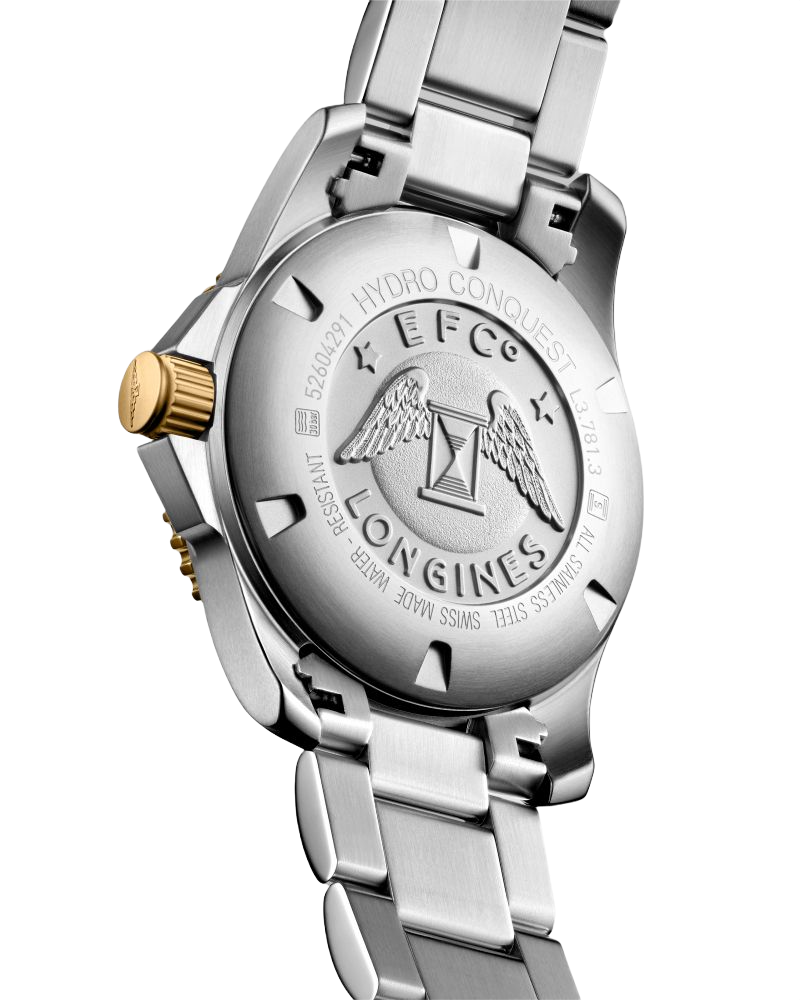 Мужские механические швейцарские часы с автоподзаводом Longines HydroConquest L3.781.3.06.7. Сапфировое стеклоСапфировое стеклоПрочный и надёжный материал из кристалла сапфира синтетического происхождения, характеризующийся особой твёрдостью и устойчивостью к царапинам и повреждениям. с антибликовым покрытием, устойчивое к мелким механическим повреждениям. Корпус часов изготовлен из нержавеющей стали. Вращающийся стальной безельБезельВнешний ободок, закрепляющий стекло. В спортивных часах так называется поворотное кольцо с делениями на циферблате, выполняет роль таймера – замеряет отрезки времени на шкале. Неподвижный безель – элемент декора. Однонаправленно вращающийся безель на дайверских часах позволяет фиксировать моменты погружения и выныривания на поверхность. с люминесцентным покрытиемЛюминесцентное покрытиеПозволяет считывать показания времени в темноте. Производители наносят на стрелки, часовые индексы, безель или поверхность циферблата светонакопительный состав, дающий холодное свечение. Superluminova из нержавеющей стали с PVD-покрытиемPVDУльтратонкое покрытие наносится в технике вакуумного напыления, сочетает в себе нитрид титана особой прочности со слоем золота или оксида хрома. Несёт в себе декоративную или защитную функцию. и керамики, защищенный от царапин, никогда не изнашивается и не выцветает. Стрелки и метки с люминесцентным покрытиемЛюминесцентное покрытиеПозволяет считывать показания времени в темноте. Производители наносят на стрелки, часовые индексы, безель или поверхность циферблата светонакопительный состав, дающий холодное свечение.. Окошко даты находится в положении 3 часа. Класс водозащиты: 300 метров, позволит плавать, нырять и заниматься другими водными видами спорта. Стальной браслет с частичным PVD-покрытиемPVDУльтратонкое покрытие наносится в технике вакуумного напыления, сочетает в себе нитрид титана особой прочности со слоем золота или оксида хрома. Несёт в себе декоративную или защитную функцию. на раскладной застёжкеРаскладная застёжкаТакой тип застёжки используется только на браслетах из металла. Она никогда не раскрывается полностью, происходит разделение на 2 и более частей. Раскладывающая застёжка снизит вероятность потери часов к минимуму. с удлинением для дайверов.