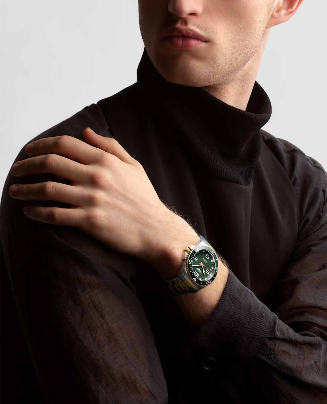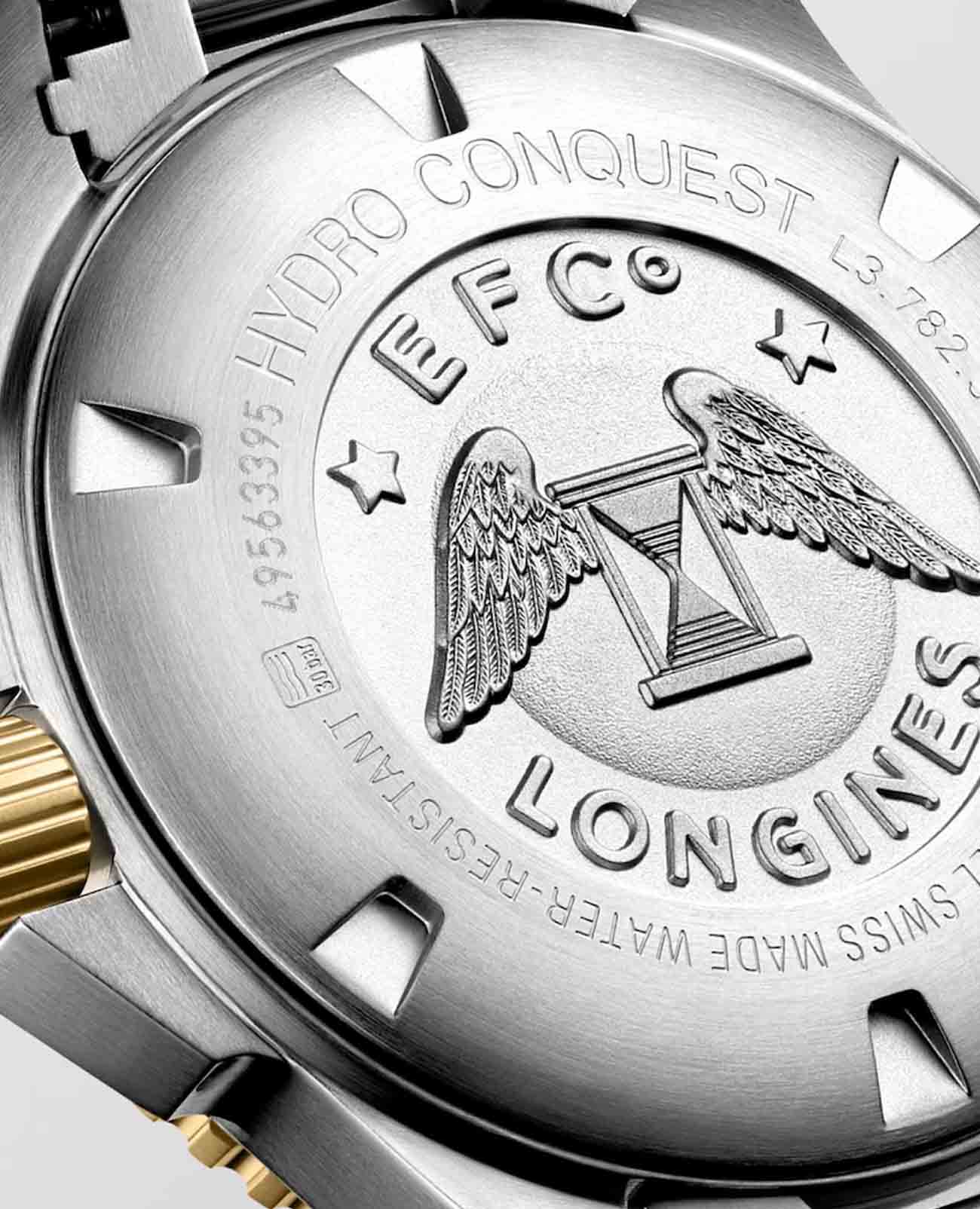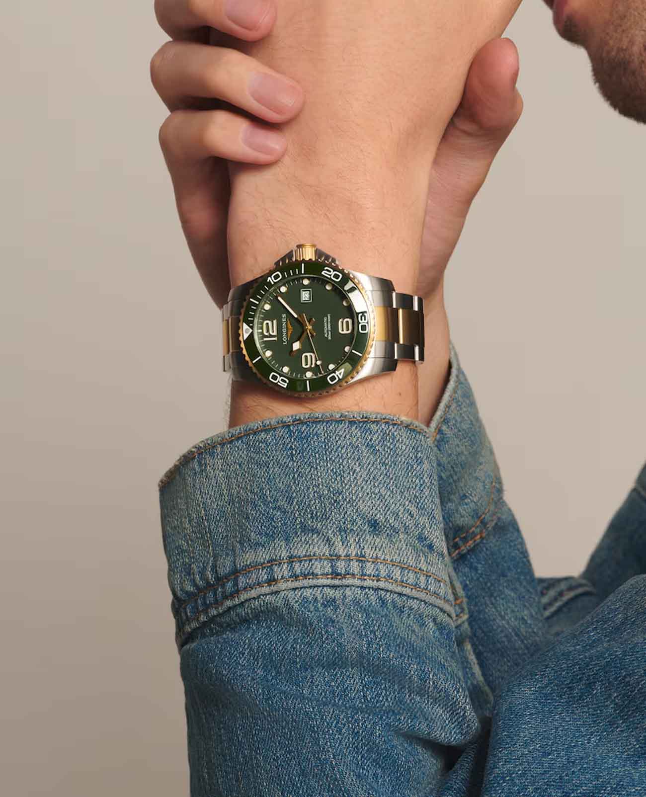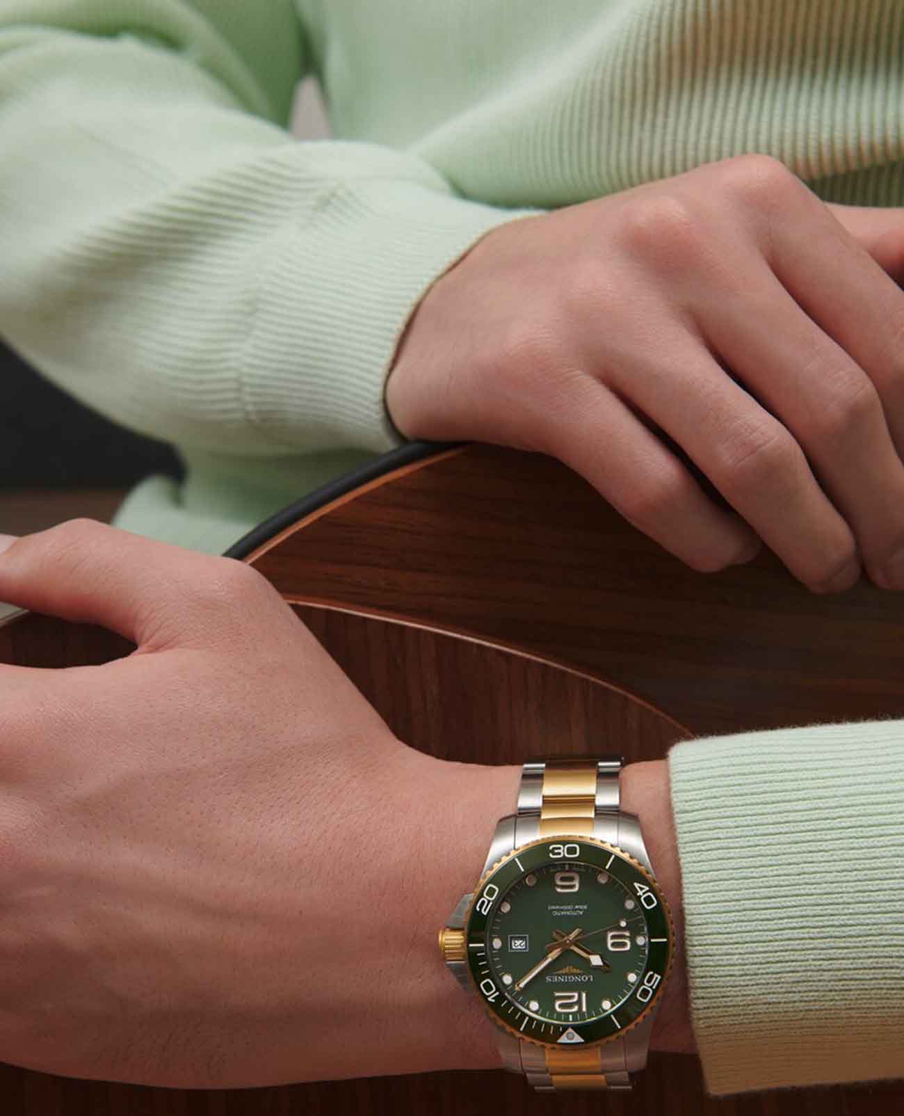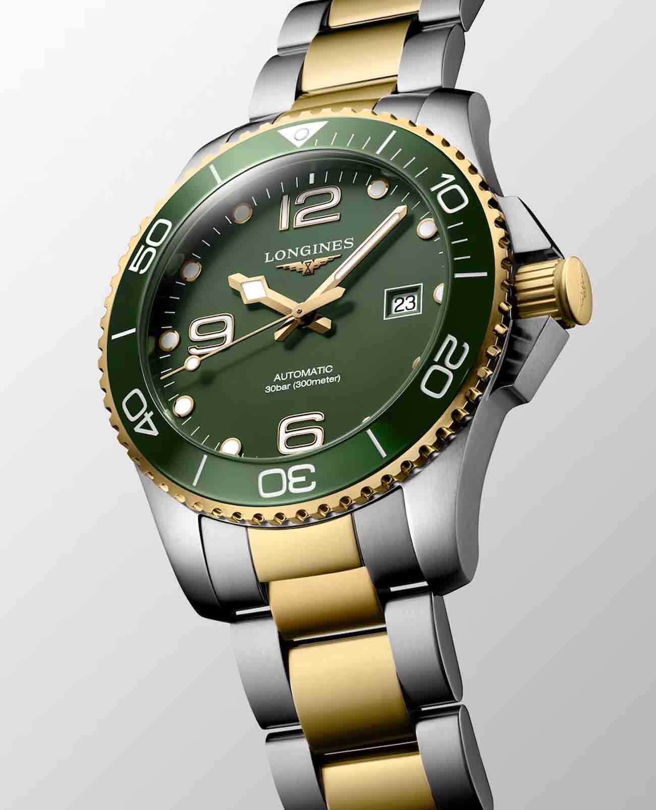Часы Longines HydroConquest (артикул L37823067) сочетают элегантность с высокими техническими характеристиками, характерными для дайверских моделей. Корпус диаметром 43 мм выполнен из нержавеющей стали с жёлтым PVD-покрытиемPVDУльтратонкое покрытие наносится в технике вакуумного напыления, сочетает в себе нитрид титана особой прочности со слоем золота или оксида хрома. Несёт в себе декоративную или защитную функцию. и водозащитой до 30 бар (300 метров). Однонаправленный вращающийся , завинчивающиеся заводная головка и задняя крышка подчёркивают надёжность. Матовый зелёный циферблат оснащён накладными арабскими цифрами и индексами с люминесцентным покрытием Swiss Super-LumiNova®Люминесцентное покрытиеПозволяет считывать показания времени в темноте. Производители наносят на стрелки, часовые индексы, безель или поверхность циферблата светонакопительный состав, дающий холодное свечение., стрелками с люминесцентным покрытиемЛюминесцентное покрытиеПозволяет считывать показания времени в темноте. Производители наносят на стрелки, часовые индексы, безель или поверхность циферблата светонакопительный состав, дающий холодное свечение., а также окошком даты в положении «3 часа». Циферблат защищён сапфировым стекломСапфировое стеклоПрочный и надёжный материал из кристалла сапфира синтетического происхождения, характеризующийся особой твёрдостью и устойчивостью к царапинам и повреждениям. с антибликовым покрытием.