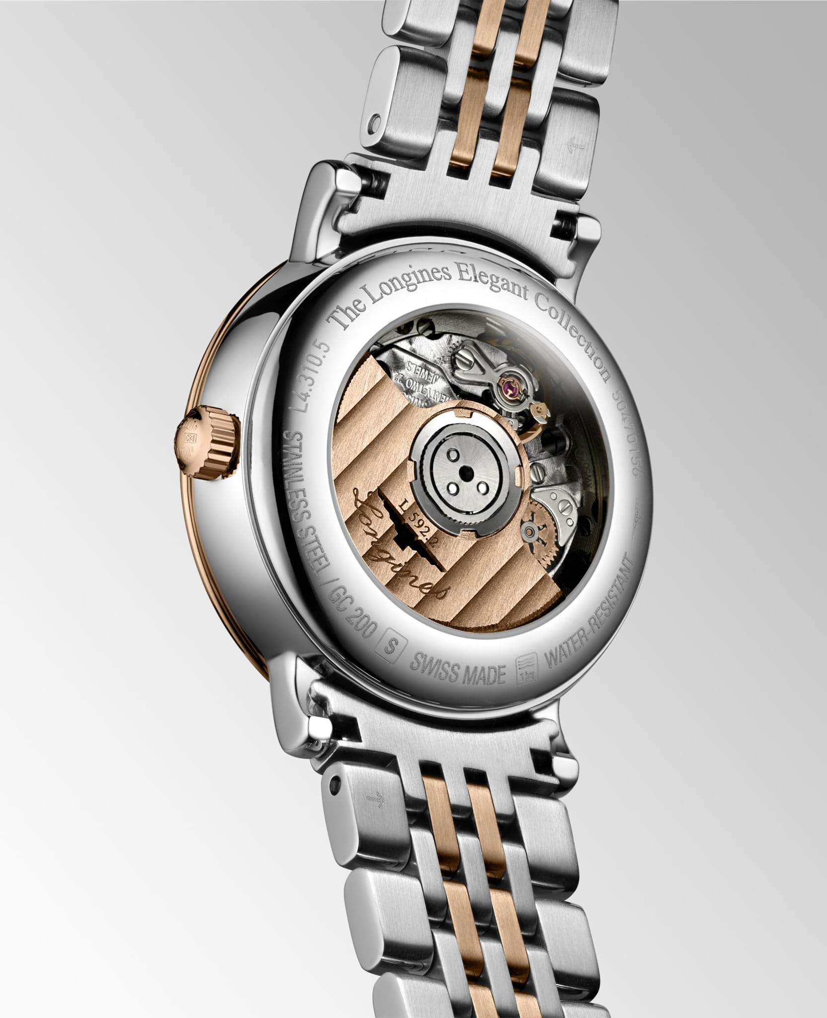 Женские швейцарские механические часы Longines Elegant Collection L4.310.5.77.7 – идеальный вариант для строгого делового образа. Сапфировое стеклоСапфировое стеклоПрочный и надёжный материал из кристалла сапфира синтетического происхождения, характеризующийся особой твёрдостью и устойчивостью к царапинам и повреждениям. устойчивое к появлению царапин, обладающее высокой прозрачностью. Модель выполнена из нержавеющей стали 316L и 18-ти каратного розового золота18-каратное золотоОбозначение по каратной системе пробирования, оно показывает, сколько драгоценного металла содержится в изделии. 18 карат - в составе 75% чистого золота, соответствует 750 пробе.