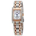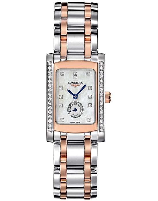 Женские швейцарские часы с бриллиантами Longines DolceVita L5.155.5.89.7, кварцевый механизм с высокой точностью. Сапфировое стеклоСапфировое стеклоПрочный и надёжный материал из кристалла сапфира синтетического происхождения, характеризующийся особой твёрдостью и устойчивостью к царапинам и повреждениям. устойчивое к появлению царапин, обладающее высокой прозрачностью. Класс водозащиты: 30 метров, позволит защитить корпус от случайных брызг или капель дождя. Браслет из нержавеющей стали со звеньями из розового золота. Фиксированный безель из нержавеющей стали с кольцом из розового золота и бриллиантами. Белый перламутровый циферблат с черными стрелками и бриллиантовыми часовыми метками. Застёжка бабочка с кнопкамиЗастёжка "бабочка"Такой вид застёжки дополняется предохранителями, помогающими избежать случайного раскрытия браслета. Обладают изящным исполнением. .