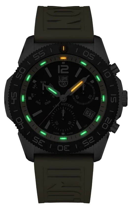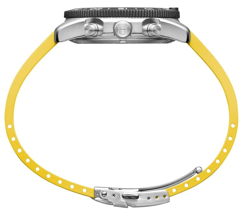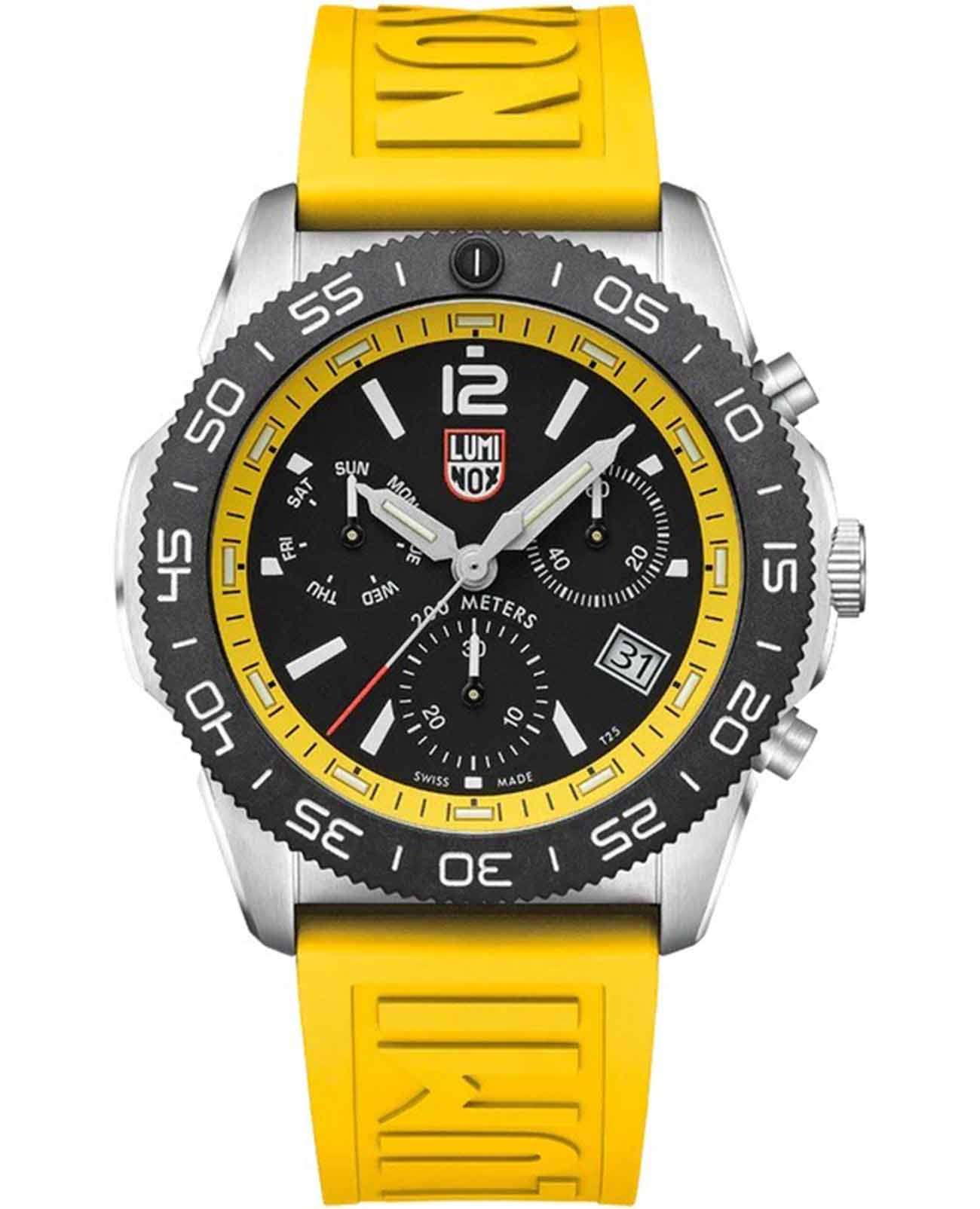 Швейцарские наручные часы Luminox Pacific Diver Chronograph XS.3145 – это идеальный симбиоз стиля и высокой функциональности. Оснащенные высокоточным кварцевым механизмом, они гарантируют безупречное времяизмерение и надежность в любом случае. Часы-хронографХронографФункция позволяет измерять отрезки времени с особой точностью: часы, минуты, секунды. Верным признаком хронографа является наличие на циферблате 3 дополнительных окошек-счётчиков. обладают функцией секундомераСекундомерСекундоме́р — прибор, способный измерять интервалы времени с точностью до долей секунды., что делает их практичными в использовании. Циферблат этих часов защищен сапфировым стекломСапфировое стеклоПрочный и надёжный материал из кристалла сапфира синтетического происхождения, характеризующийся особой твёрдостью и устойчивостью к царапинам и повреждениям. с антибликовым покрытиемАнтибликовое покрытиеСлой оксида металла в 0,13-0,3 микрон, благодаря которому стекло часов не бликует и не отражает свет. Антибликовое покрытие уменьшает отражение света в 10 раз, обеспечивая отличную читаемость показателей циферблата., которое славится своей прочностью и устойчивостью к царапинам, обеспечивая кристально чистый обзор. Корпус часов выполнен из качественной стали, что свидетельствует о долговечности и прочности изделия. Стрелки с LLTLLTLLT — это автономный механизм подсветки, основанный на использовании микроскопических газонаполненных элементов. Специальные герметичные капсулы из боросиликатного стекла, интегрированные в циферблат, генерируют свечение без необходимости подключения к внешним источникам энергии. Для их работы не требуется ни дополнительный свет, ни механическое воздействие (например, нажатие кнопки). Свечение возникает благодаря химическому процессу: реакция между тритием, заключенным в капсулах, и люминофорным покрытием создает стабильное автономное освещение. Технология обеспечивает энергетическую независимость и долговечность подсветки.-подсветкой, обеспечивают отличную видимость даже в условиях недостаточной освещенности, что делает их удобными для использования в любых условиях. Дополнительно часы располагают окошком даты в положении 4 часа, позволяющим быстро и удобно отслеживать текущую дату. Их внушительный класс водозащиты в 200 метров делает их идеальными для любителей водных видов спорта, таких как плавание и ныряние, не беспокоясь о повреждении механизма. Каучуковый ремешок желтого, надёжно фиксирующий часы на запястье с помощью раскладной застёжкиРаскладная застёжкаТакой тип застёжки используется только на браслетах из металла. Она никогда не раскрывается полностью, происходит разделение на 2 и более частей. Раскладывающая застёжка снизит вероятность потери часов к минимуму., обеспечивает комфортное ношение в течение всего дня. Стильный вращающийся безельБезельВнешний ободок, закрепляющий стекло. В спортивных часах так называется поворотное кольцо с делениями на циферблате, выполняет роль таймера – замеряет отрезки времени на шкале. Неподвижный безель – элемент декора. Однонаправленно вращающийся безель на дайверских часах позволяет фиксировать моменты погружения и выныривания на поверхность., изготовленный из карбонаКарбонОт «carbon», «carbone» - углерод, углепластик - полимерный композиционный материал из п