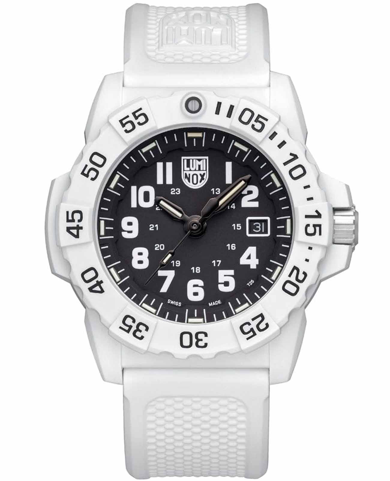 Часы Luminox XS.3507.WB — это надежные и стильные швейцарские часы с кварцевым механизмом, оснащенные калибром Ronda 515. Корпус выполнен из пластика, усиленного прессованным карбоном CARBONOX, что обеспечивает прочность и долговечность. Черный циферблат защищен минеральным стекломМинеральное стеклоМинеральное стекло представляет собой искусственно выращенный минерал кварца. Такое стекло отличается особой устойчивостью к повреждениям и царапинам. Уступает по некоторым качествам сапфировому стеклу. повышенной прочности, что делает его устойчивым к царапинам и ударам. Резиновый ремешок с классической застежкой обеспечивает комфортное ношение и надежность фиксации на запястье. Эти часы обладают впечатляющим уровнем водозащиты до 200 метров, что делает их подходящими для водных видов спорта и активного отдыха. Светящаяся метка на безелеБезельВнешний ободок, закрепляющий стекло. В спортивных часах так называется поворотное кольцо с делениями на циферблате, выполняет роль таймера – замеряет отрезки времени на шкале. Неподвижный безель – элемент декора. Однонаправленно вращающийся безель на дайверских часах позволяет фиксировать моменты погружения и выныривания на поверхность., который вращается в одном направлении, добавляет функциональности и удобства, особенно в условиях низкой освещенности. Технология LLTLLTLLT — это автономный механизм подсветки, основанный на использовании микроскопических газонаполненных элементов. Специальные герметичные капсулы из боросиликатного стекла, интегрированные в циферблат, генерируют свечение без необходимости подключения к внешним источникам энергии. Для их работы не требуется ни дополнительный свет, ни механическое воздействие (например, нажатие кнопки). Свечение возникает благодаря химическому процессу: реакция между тритием, заключенным в капсулах, и люминофорным покрытием создает стабильное автономное освещение. Технология обеспечивает энергетическую независимость и долговечность подсветки.-подсветки обеспечивает отличную видимость в темноте на протяжении 25 лет, позволяя контролировать время даже при полном отсутствии света. Часы поддерживают отображение времени в 12- и 24-часовом формате, а наличие календаря с указанием числа добавляет практичности. Заводная головка снабжена защитой и двойной уплотнительной прокладкой для обеспечения герметичности, а задняя крышка крепится на винтах для дополнительной надежности.