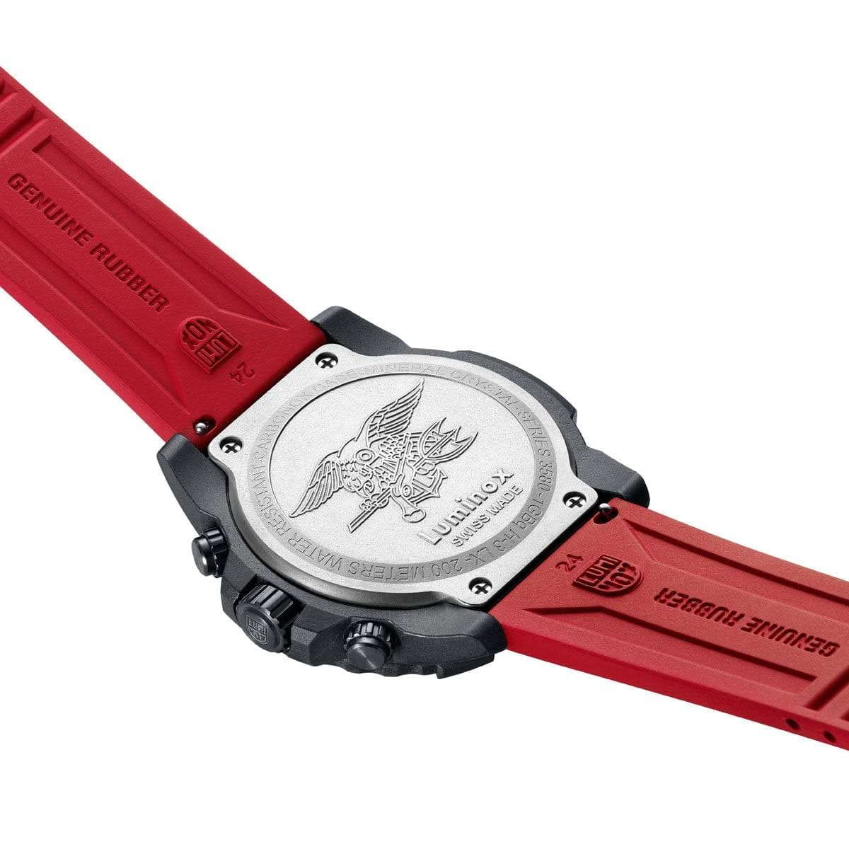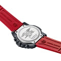 Часы Luminox XS.CE81.EY — это надежные и стильные швейцарские часы с кварцевым механизмом, оснащенные калибром Ronda 5030.D. Корпус выполнен из пластика, усиленного прессованным карбоном CARBONOX, что обеспечивает прочность и долговечность. Черный циферблат защищен минеральным стекломМинеральное стеклоМинеральное стекло представляет собой искусственно выращенный минерал кварца. Такое стекло отличается особой устойчивостью к повреждениям и царапинам. Уступает по некоторым качествам сапфировому стеклу. повышенной прочности, что делает его устойчивым к царапинам и ударам. Каучуковый ремешок красного цвета с раскладной застёжкойРаскладная застёжкаТакой тип застёжки используется только на браслетах из металла. Она никогда не раскрывается полностью, происходит разделение на 2 и более частей. Раскладывающая застёжка снизит вероятность потери часов к минимуму. обеспечивает комфортное ношение и надежность фиксации на запястье. Эти часы обладают впечатляющим уровнем водозащиты до 200 метров, что делает их подходящими для водных видов спорта и активного отдыха. Светящаяся метка на безелеБезельВнешний ободок, закрепляющий стекло. В спортивных часах так называется поворотное кольцо с делениями на циферблате, выполняет роль таймера – замеряет отрезки времени на шкале. Неподвижный безель – элемент декора. Однонаправленно вращающийся безель на дайверских часах позволяет фиксировать моменты погружения и выныривания на поверхность., который вращается в одном направлении, добавляет функциональности и удобства, особенно в условиях низкой освещенности. Технология LLTLLTLLT — это автономный механизм подсветки, основанный на использовании микроскопических газонаполненных элементов. Специальные герметичные капсулы из боросиликатного стекла, интегрированные в циферблат, генерируют свечение без необходимости подключения к внешним источникам энергии. Для их работы не требуется ни дополнительный свет, ни механическое воздействие (например, нажатие кнопки). Свечение возникает благодаря химическому процессу: реакция между тритием, заключенным в капсулах, и люминофорным покрытием создает стабильное автономное освещение. Технология обеспечивает энергетическую независимость и долговечность подсветки.-подсветки обеспечивает отличную видимость в темноте на протяжении 25 лет, позволяя контролировать время даже при полном отсутствии света. Часы-хронографХронографФункция позволяет измерять отрезки времени с особой точностью: часы, минуты, секунды. Верным признаком хронографа является наличие на циферблате 3 дополнительных окошек-счётчиков. обладают функцией секундомераСекундомерСекундоме́р — прибор, способный измерять интервалы времени с точностью до долей секунды. и поддерживают 12- и 24-часовой формат времени и календаря, что делает их практичными в использовании. Заводная головка снабжена защитой и двойной уплотнительной прокладкой для обеспечения герметичности, а задняя крышка крепится на винтах для дополнительной надежности.