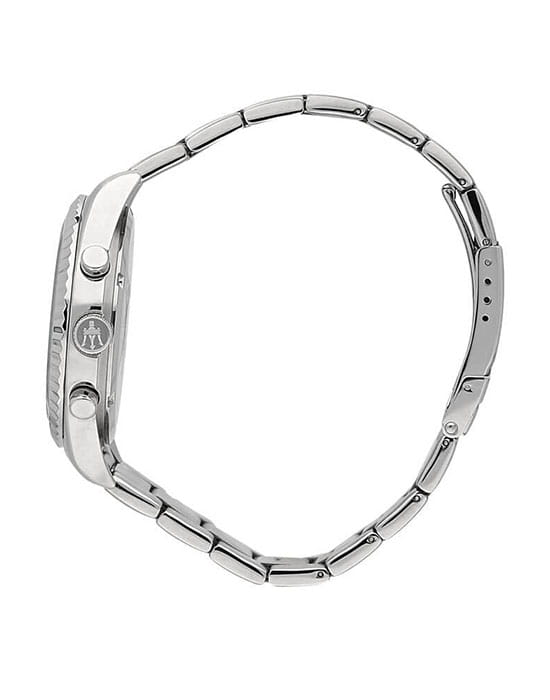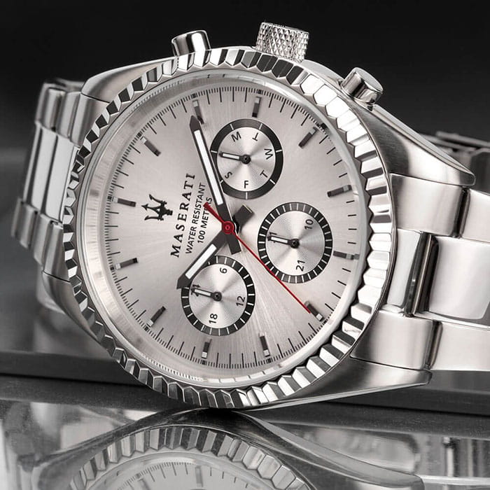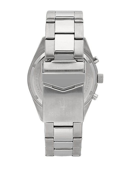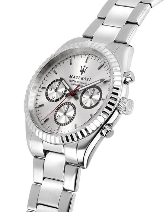 Мужские часы с хронографом Maserati COMPETIZIONE R8853100018, кварцевый механизм с высокой точностью. Класс водозащиты: 100 метров, позволит плавать, нырять и заниматься другими водными видами спорта. Корпус часов изготовлен из стали, серебристого цвета.