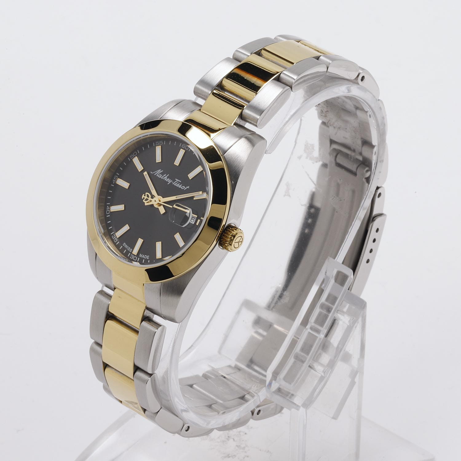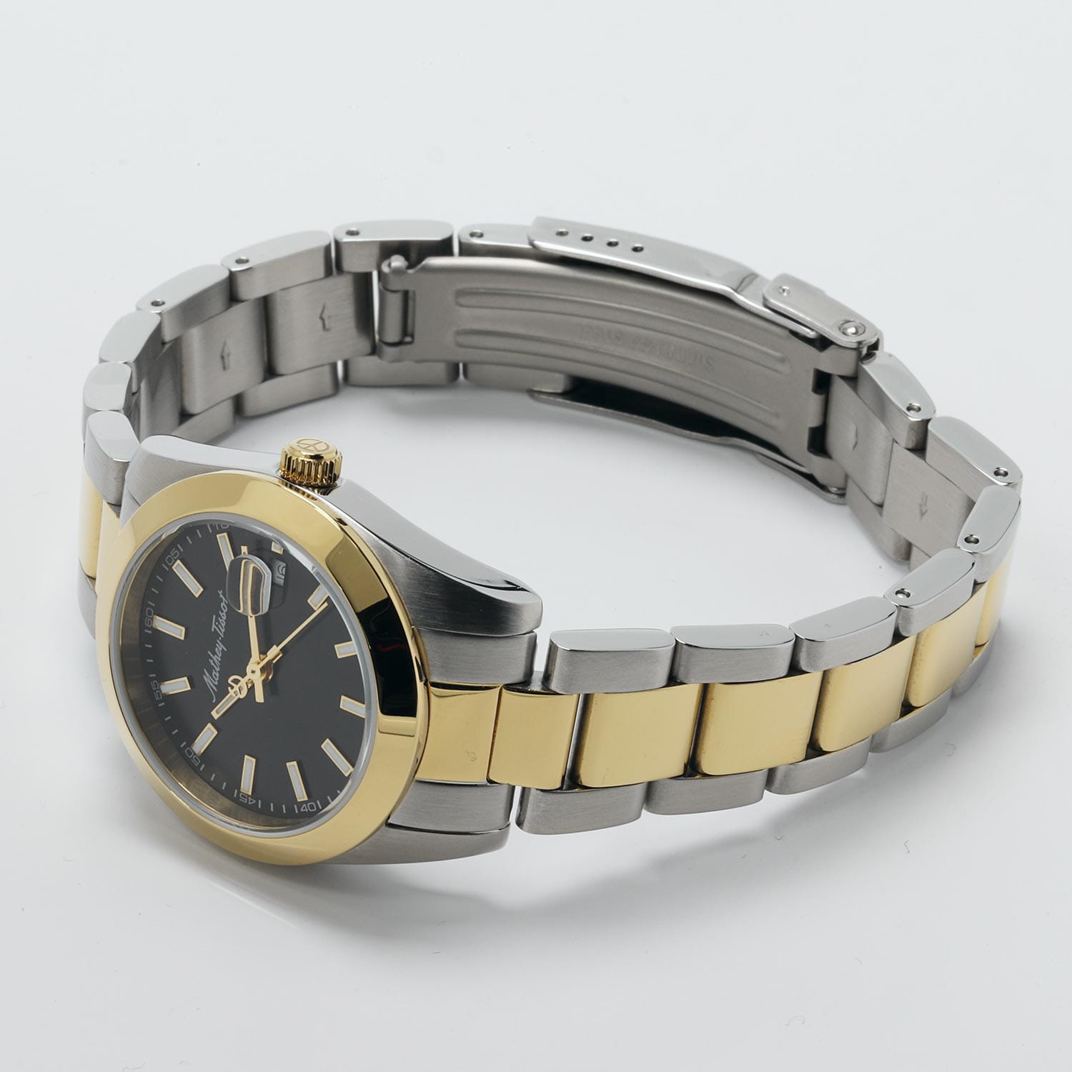 Женские кварцевые часы Mathey-Tissot Mathy D450BN — это стильное сочетание элегантности и современного дизайна. Изящный корпус выполнен из нержавеющей стали, диаметром 30 мм, что придаст образу женственности и романтизма. Изысканный циферблат с метками в виде штрихов придает модели особый блеск. Циферблат защищен минеральным стекломМинеральное стеклоМинеральное стекло представляет собой искусственно выращенный минерал кварца. Такое стекло отличается особой устойчивостью к повреждениям и царапинам. Уступает по некоторым качествам сапфировому стеклу., обеспечивающий устойчивость к царапинам. Стрелки и метки с люминесцентным покрытиемЛюминесцентное покрытиеПозволяет считывать показания времени в темноте. Производители наносят на стрелки, часовые индексы, безель или поверхность циферблата светонакопительный состав, дающий холодное свечение.. БезельБезельВнешний ободок, закрепляющий стекло. В спортивных часах так называется поворотное кольцо с делениями на циферблате, выполняет роль таймера – замеряет отрезки времени на шкале. Неподвижный безель – элемент декора. Однонаправленно вращающийся безель на дайверских часах позволяет фиксировать моменты погружения и выныривания на поверхность. с PVD-покрытиемPVDУльтратонкое покрытие наносится в технике вакуумного напыления, сочетает в себе нитрид титана особой прочности со слоем золота или оксида хрома. Несёт в себе декоративную или защитную функцию. золотистого цвета. Окошко даты находится в положении 3 часа. Часы оснащены надежным кварцевым механизмом. Стальной браслет с частичным PVD-покрытиемPVDУльтратонкое покрытие наносится в технике вакуумного напыления, сочетает в себе нитрид титана особой прочности со слоем золота или оксида хрома. Несёт в себе декоративную или защитную функцию. на раскладной застёжке с фиксаторомРаскладная застёжкаТакой тип застёжки используется только на браслетах из металла. Она никогда не раскрывается полностью, происходит разделение на 2 и более частей. Раскладывающая застёжка снизит вероятность потери часов к минимуму., гарантирует комфортное и безопасное ношение. Класс водозащиты: 50 метров позволит защитить корпус от случайных брызг или капель дождя. Mathey-Tissot  — отличный выбор для тех, кто ценит утонченность и качество.