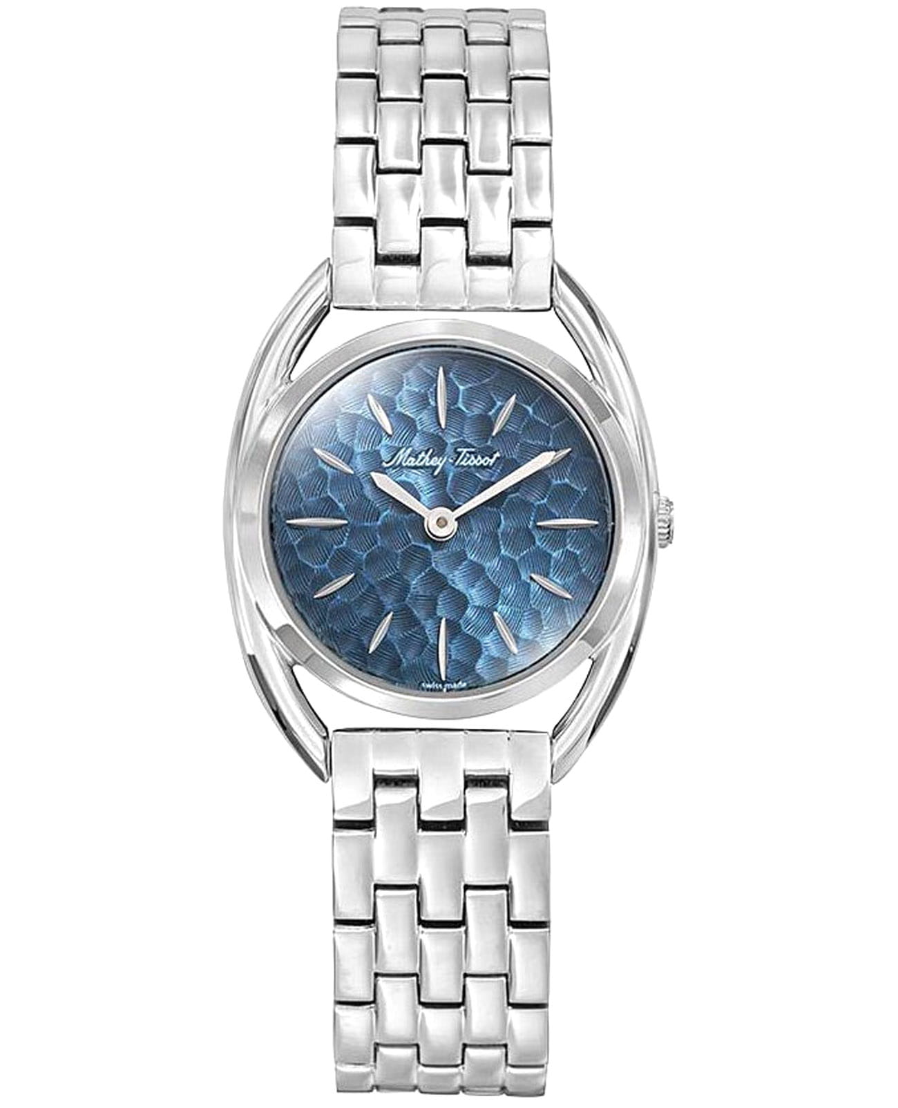 Женские кварцевые часы Mathey-Tissot Saphira D933ABU — это стильное сочетание элегантности и современного дизайна. Изящный корпус выполнен из стали 316L  и прекрасно впишется в ваш исключительный стиль. Изысканный циферблат с метками придает модели особый блеск и защищен минеральным стекломМинеральное стеклоМинеральное стекло представляет собой искусственно выращенный минерал кварца. Такое стекло отличается особой устойчивостью к повреждениям и царапинам. Уступает по некоторым качествам сапфировому стеклу., обеспечивающим устойчивость к царапинам. Циферблат украшен декоративным узором. Мечевидные стрелки в стиле Sword с люминесцентным покрытиемЛюминесцентное покрытиеПозволяет считывать показания времени в темноте. Производители наносят на стрелки, часовые индексы, безель или поверхность циферблата светонакопительный состав, дающий холодное свечение., которое светится в темноте после непродолжительной зарядки на свету. Часы оснащены надежным кварцевым механизмом. Стальной браслет на застёжке-бабочке с кнопкамиЗастёжка "бабочка"Такой вид застёжки дополняется предохранителями, помогающими избежать случайного раскрытия браслета. Обладают изящным исполнением. гарантирует комфортное и безопасное ношение. Класс водозащиты: 50 метров позволит защитить корпус от случайных брызг или капель дождя. Mathey-Tissot  — отличный выбор для тех, кто ценит утонченность и качество.