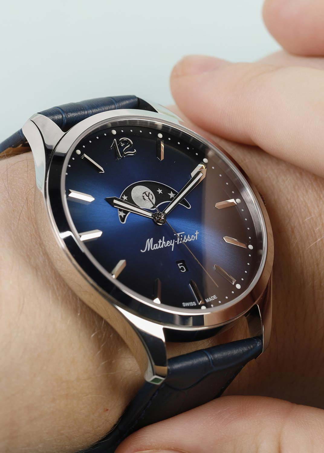 Мужские кварцевые часы Mathey-Tissot Urban H411LABU — это стильное сочетание элегантности и современного дизайна. Изящный корпус выполнен из нержавеющей стали, диаметром 42 мм, что придаст образу элегантности и надежности. Изысканный циферблат с метками в виде штрихов придает модели особый блеск. Циферблат защищен минеральным стекломМинеральное стеклоМинеральное стекло представляет собой искусственно выращенный минерал кварца. Такое стекло отличается особой устойчивостью к повреждениям и царапинам. Уступает по некоторым качествам сапфировому стеклу. с сапфировым покрытием, обеспечивает устойчивость к царапинам. Стрелки с люминесцентным покрытиемЛюминесцентное покрытиеПозволяет считывать показания времени в темноте. Производители наносят на стрелки, часовые индексы, безель или поверхность циферблата светонакопительный состав, дающий холодное свечение.. Окошко даты находится в положении 6 часов. Фазы Луны. Часы оснащены надежным кварцевым механизмом. Кожаный ремешок на стандартной застёжке гарантирует комфортное и безопасное ношение. Класс водозащиты: 50 метров позволит защитить корпус от случайных брызг или капель дождя. Mathey-Tissot — отличный выбор для тех, кто ценит утонченность и качество.