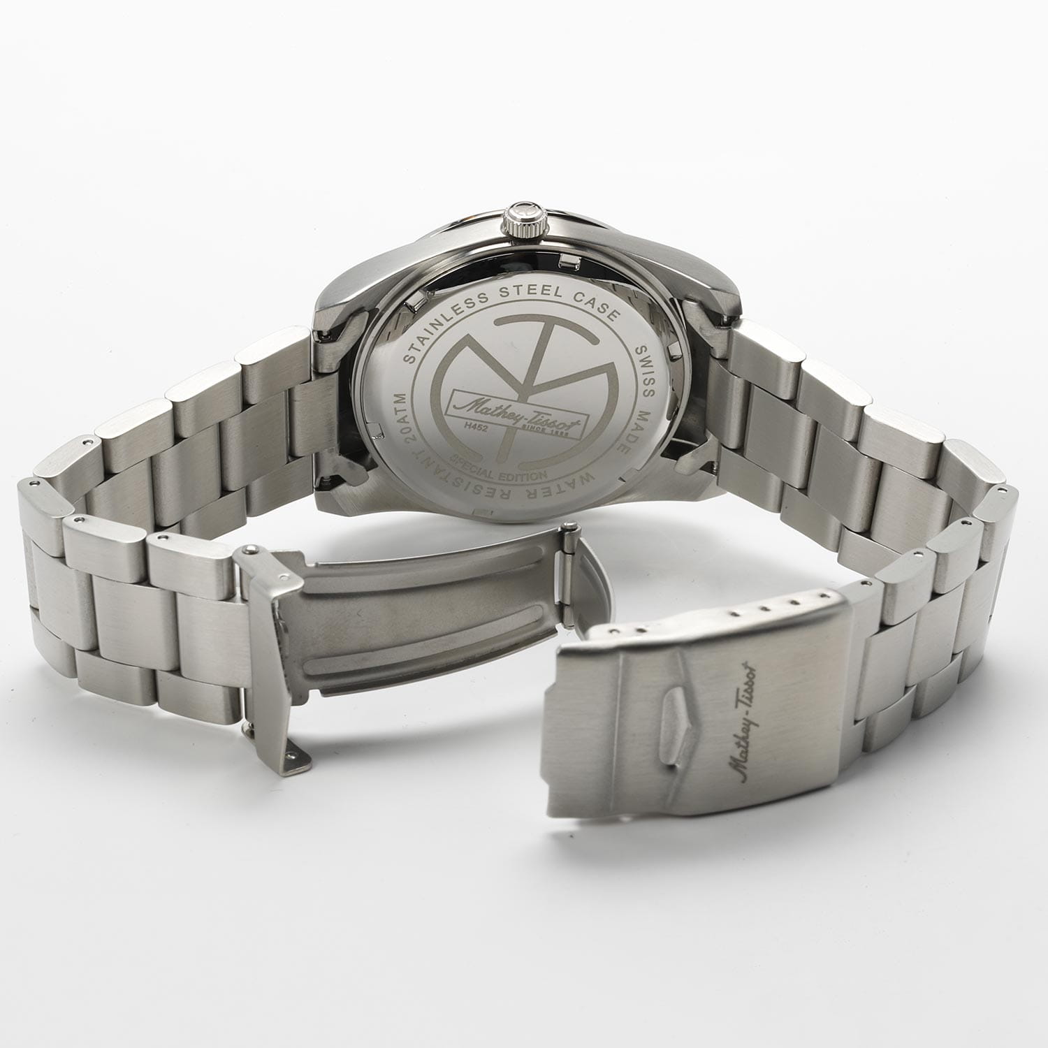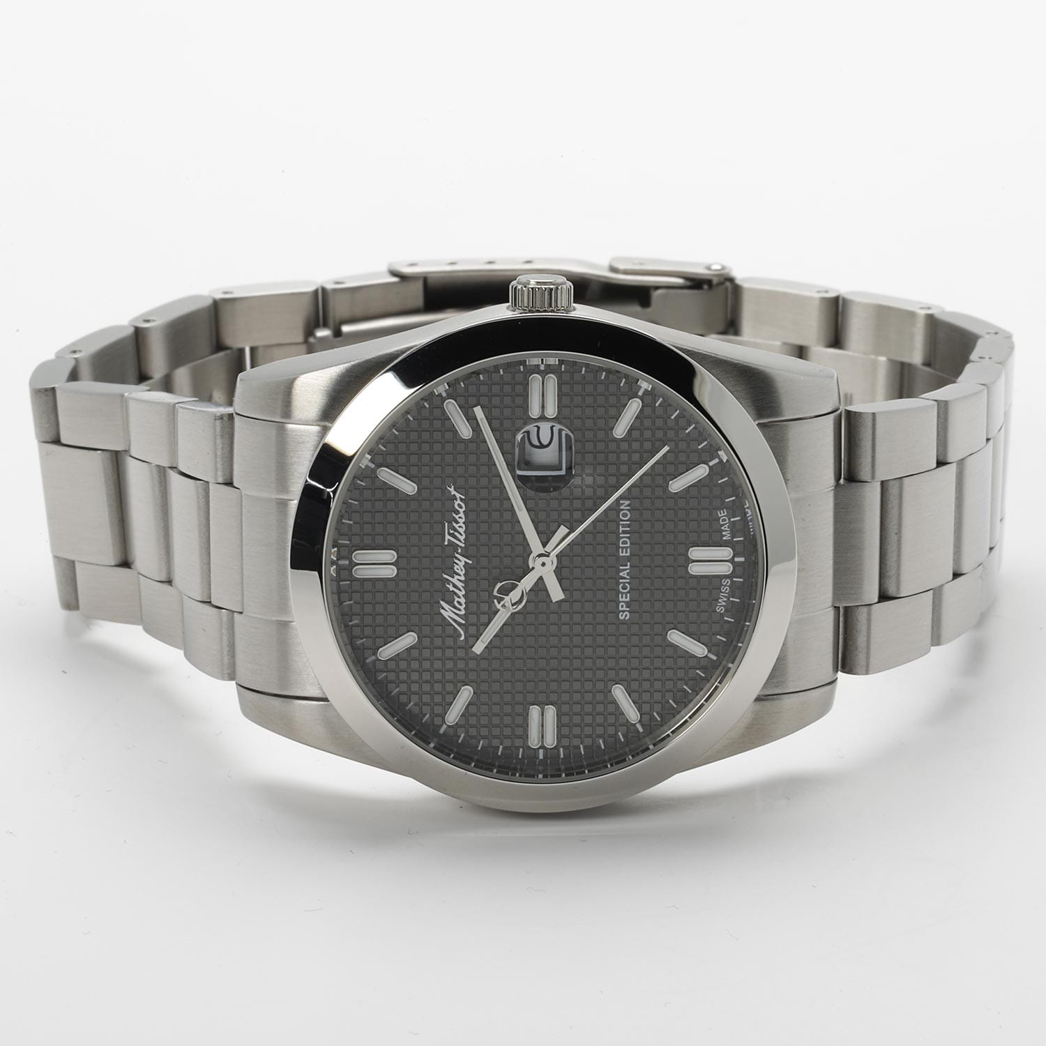 Мужские кварцевые часы Mathey-Tissot Mathy H452AS — это стильное сочетание элегантности и современного дизайна. Специальный выпуск. Изящный корпус выполнен из нержавеющей стали, диаметром 42 мм, что придаст образу элегантности и надежности. Изысканный циферблат с метками в виде штрихов придает модели особый блеск. Циферблат защищен минеральным стекломМинеральное стеклоМинеральное стекло представляет собой искусственно выращенный минерал кварца. Такое стекло отличается особой устойчивостью к повреждениям и царапинам. Уступает по некоторым качествам сапфировому стеклу. с сапфировым покрытием, обеспечивает устойчивость к царапинам. Стрелки и метки с люминесцентным покрытиемЛюминесцентное покрытиеПозволяет считывать показания времени в темноте. Производители наносят на стрелки, часовые индексы, безель или поверхность циферблата светонакопительный состав, дающий холодное свечение.. Окошко даты находится в положении 3 часа. Часы оснащены надежным кварцевым механизмом. Стальной браслет на раскладной застёжке с фиксаторомРаскладная застёжкаТакой тип застёжки используется только на браслетах из металла. Она никогда не раскрывается полностью, происходит разделение на 2 и более частей. Раскладывающая застёжка снизит вероятность потери часов к минимуму., гарантирует комфортное и безопасное ношение. Рифленая заводная головка. Класс водозащиты: 200 метров позволит плавать, нырять и заниматься другими водными видами спорта. Mathey-Tissot  — отличный выбор для тех, кто ценит утонченность и качество.