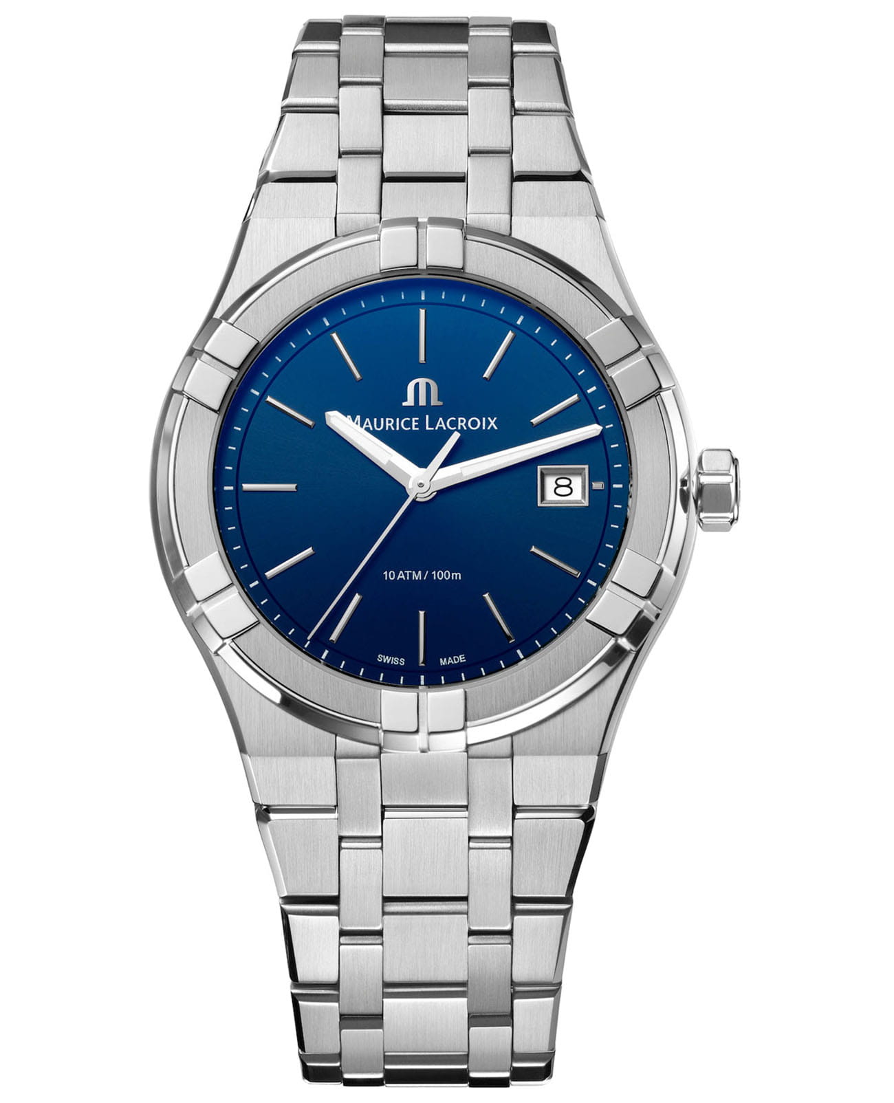 Мужские швейцарские кварцевые часы Maurice Lacroix Aikon Quartz AI1108-SS002-430-1. Сапфировое стеклоСапфировое стеклоПрочный и надёжный материал из кристалла сапфира синтетического происхождения, характеризующийся особой твёрдостью и устойчивостью к царапинам и повреждениям. устойчивое к появлению царапин, обладающее высокой прозрачностью. Синий циферблат. Стрелки с люминесцентным покрытиемЛюминесцентное покрытиеПозволяет считывать показания времени в темноте. Производители наносят на стрелки, часовые индексы, безель или поверхность циферблата светонакопительный состав, дающий холодное свечение.. Класс водозащиты: 100 метров, позволит плавать, нырять и заниматься другими водными видами спорта. Окошко даты находится в положении 3 часов. Корпус и браслет часов изготовлены из стали. Браслет с застёжкой «бабочка» с кнопкамиЗастёжка "бабочка"Такой вид застёжки дополняется предохранителями, помогающими избежать случайного раскрытия браслета. Обладают изящным исполнением. .