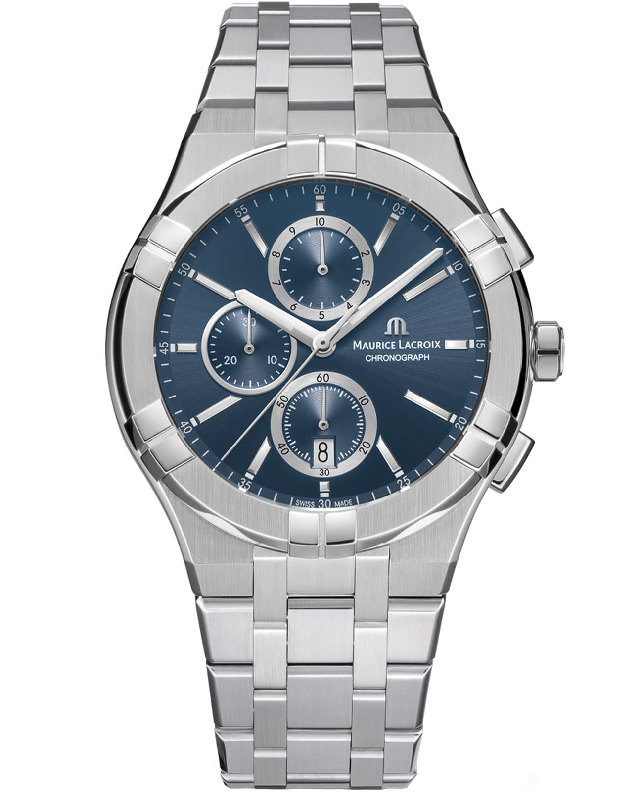 Часы Maurice Lacroix AIKON Quartz Chronograph (артикул AI1118-SS002-430-1) — элегантная унисекс-модель, сочетающая современный дизайн и швейцарское качество. Корпус диаметром 42 мм выполнен из нержавеющей стали с полированными и сатинированными поверхностями. Тёмно-синий циферблат с родиевыми стрелками и метками, покрытыми люминесцентным составом Super-LumiNovaЛюминесцентное покрытиеПозволяет считывать показания времени в темноте. Производители наносят на стрелки, часовые индексы, безель или поверхность циферблата светонакопительный состав, дающий холодное свечение., защищён сапфировым стекломСапфировое стеклоПрочный и надёжный материал из кристалла сапфира синтетического происхождения, характеризующийся особой твёрдостью и устойчивостью к царапинам и повреждениям. с двойным антибликовым покрытием.