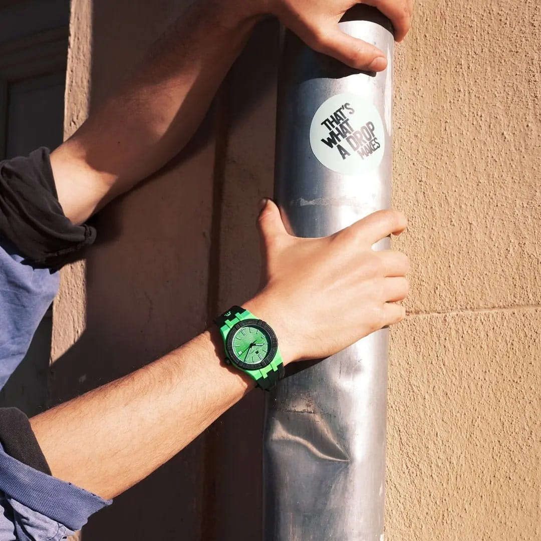 Часы AIKON #tide обладают всеми преимуществами AIKON, но кроме того, они выполнены из особого материала под названием #tideocean – переработанного океанского пластика, усиленного стекловолокном. В результате сложного технологического процесса переработки получен композитный материал, вдвое превосходящий по прочности обычный пластик. Износостойкость композита #tideocean в пять раз выше полиэтилентерефталата (ПЭТ). И еще немаловажный экологический фактор – в процессе превращения океанского пластика в материал #tideocean углеродные выбросы в атмосферу значительно снижаются, чем при обычном процессе выпуска первичного пластика. В новой модели безельБезельВнешний ободок, закрепляющий стекло. В спортивных часах так называется поворотное кольцо с делениями на циферблате, выполняет роль таймера – замеряет отрезки времени на шкале. Неподвижный безель – элемент декора. Однонаправленно вращающийся безель на дайверских часах позволяет фиксировать моменты погружения и выныривания на поверхность., корпус, задняя крышка, заводная головка, наконечник и застежка выполнены из композитного материала #tideocean. 17 пластиковых бутылок требуется для производства одних отличных часов и их специальной упаковки, также на 100% состоящей из материала #tide, появившегося в результате отходов пластика в океане. В результате такой переработки выигрывают все. Мужские швейцарские кварцевые часы Maurice Lacroix Aikon Quartz AI2008-70070-300-0. Сапфировое стеклоСапфировое стеклоПрочный и надёжный материал из кристалла сапфира синтетического происхождения, характеризующийся особой твёрдостью и устойчивостью к царапинам и повреждениям. устойчивое к появлению царапин, обладающее высокой прозрачностью. Зеленый циферблат. Стрелки и метки с люминесцентным покрытиемЛюминесцентное покрытиеПозволяет считывать показания времени в темноте. Производители наносят на стрелки, часовые индексы, безель или поверхность циферблата светонакопительный состав, дающий холодное свечение.. Класс водозащиты: 100 метров, позволит плавать, нырять и заниматься другими водными видами спорта. Окошко даты находится в положении 3 часов. Циферблат с тематическим гильошированием "Vagues du Jura". Корпус выполнен из переработанного пластика, ранее загрязнявшего Мировой океан. Каучуковый ремешок с классической застежкой.