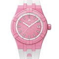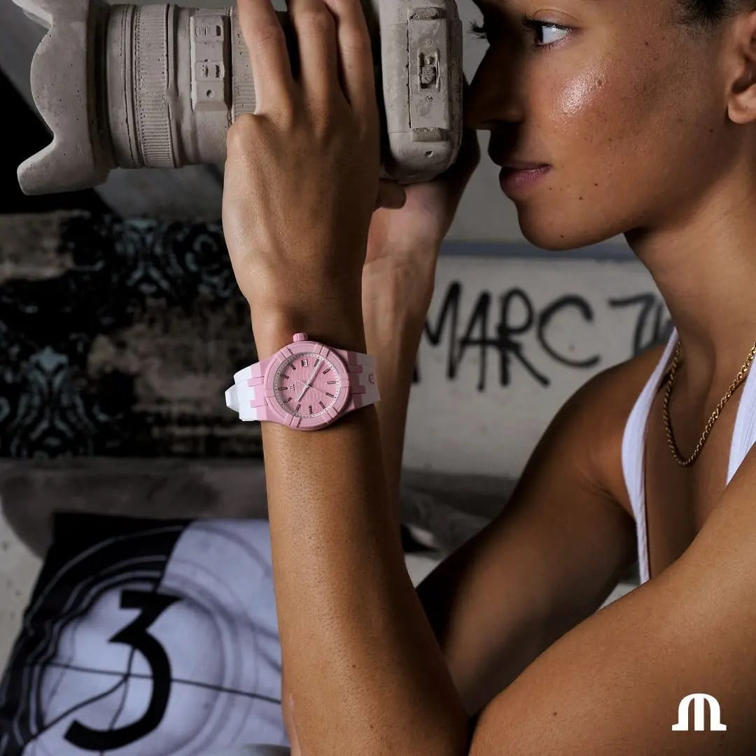 Часы AIKON #tide обладают всеми преимуществами AIKON, но кроме того, они выполнены из особого материала под названием #tideocean – переработанного океанского пластика, усиленного стекловолокном. В результате сложного технологического процесса переработки получен композитный материал, вдвое превосходящий по прочности обычный пластик. Износостойкость композита #tideocean в пять раз выше полиэтилентерефталата (ПЭТ). И еще немаловажный экологический фактор – в процессе превращения океанского пластика в материал #tideocean углеродные выбросы в атмосферу значительно снижаются, чем при обычном процессе выпуска первичного пластика. В новой модели безельБезельВнешний ободок, закрепляющий стекло. В спортивных часах так называется поворотное кольцо с делениями на циферблате, выполняет роль таймера – замеряет отрезки времени на шкале. Неподвижный безель – элемент декора. Однонаправленно вращающийся безель на дайверских часах позволяет фиксировать моменты погружения и выныривания на поверхность., корпус, задняя крышка, заводная головка, наконечник и застежка выполнены из композитного материала #tideocean. 17 пластиковых бутылок требуется для производства одних отличных часов и их специальной упаковки, также на 100% состоящей из материала #tide, появившегося в результате отходов пластика в океане. В результате такой переработки выигрывают все. Унисекс швейцарские кварцевые часы Maurice Lacroix Aikon Quartz AI2008-EEEE1-3A0-0. Сапфировое стеклоСапфировое стеклоПрочный и надёжный материал из кристалла сапфира синтетического происхождения, характеризующийся особой твёрдостью и устойчивостью к царапинам и повреждениям. устойчивое к появлению царапин, обладающее высокой прозрачностью. Розовый циферблат. Стрелки и метки с люминесцентным покрытиемЛюминесцентное покрытиеПозволяет считывать показания времени в темноте. Производители наносят на стрелки, часовые индексы, безель или поверхность циферблата светонакопительный состав, дающий холодное свечение.. Класс водозащиты: 100 метров, позволит плавать, нырять и заниматься другими водными видами спорта. Окошко даты находится в положении 3 часов. Циферблат с тематическим гильошированием "Vagues du Jura". Корпус выполнен из переработанного пластика, ранее загрязнявшего Мировой океан. Каучуковый ремешок с классической застежкой.