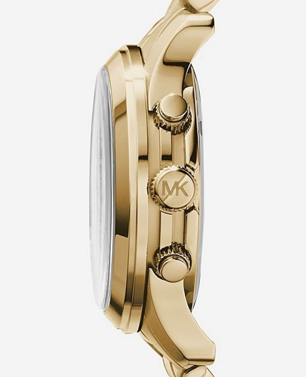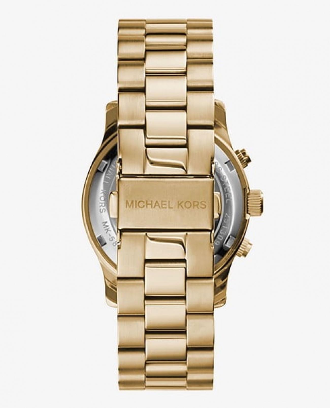 Женские американские часы-хронографХронографФункция позволяет измерять отрезки времени с особой точностью: часы, минуты, секунды. Верным признаком хронографа является наличие на циферблате 3 дополнительных окошек-счётчиков. с секундомеромСекундомерСекундоме́р — прибор, способный измерять интервалы времени с точностью до долей секунды. и с минеральным стекломМинеральное стеклоМинеральное стекло представляет собой искусственно выращенный минерал кварца. Такое стекло отличается особой устойчивостью к повреждениям и царапинам. Уступает по некоторым качествам сапфировому стеклу. Michael Kors Hunger stop MK5815, кварцевый механизм с высокой точностью. Корпус часов изготовлен из нержавеющей стали с PVD-покрытиемPVDУльтратонкое покрытие наносится в технике вакуумного напыления, сочетает в себе нитрид титана особой прочности со слоем золота или оксида хрома. Несёт в себе декоративную или защитную функцию..  Два дополнительных индикатора. Окошко даты находится в положении между 4 и 5 часами. Класс водозащиты: 100 метров, позволит плавать, нырять и заниматься другими водными видами спорта. Стальной браслет с PVD-покрытиемPVDУльтратонкое покрытие наносится в технике вакуумного напыления, сочетает в себе нитрид титана особой прочности со слоем золота или оксида хрома. Несёт в себе декоративную или защитную функцию. на раскладной застёжкеРаскладная застёжкаТакой тип застёжки используется только на браслетах из металла. Она никогда не раскрывается полностью, происходит разделение на 2 и более частей. Раскладывающая застёжка снизит вероятность потери часов к минимуму..
