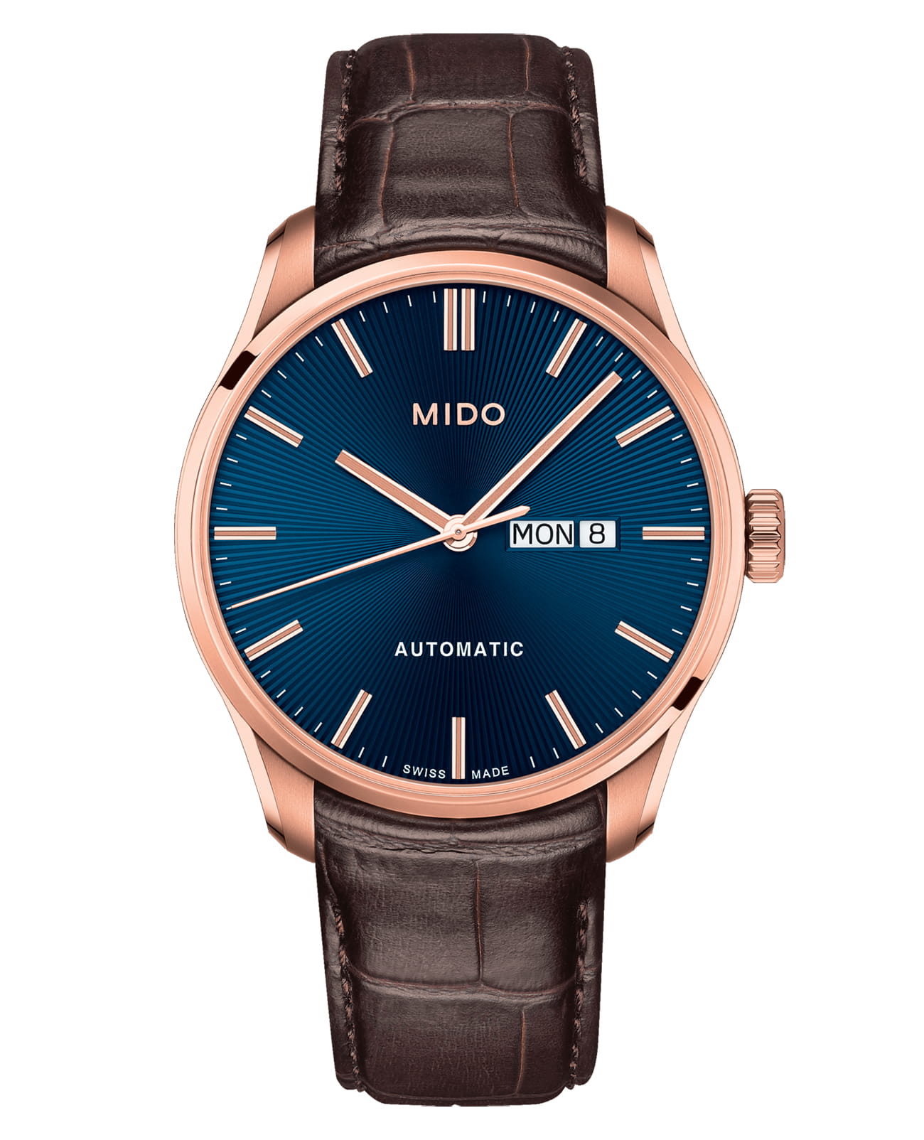 Часы MIDO Belluna Sunray (артикул M024.630.36.041.00) — элегантная модель, сочетающая современный дизайн и швейцарское качество. Корпус диаметром 42,5 мм выполнен из нержавеющей стали с PVD-покрытиемPVDУльтратонкое покрытие наносится в технике вакуумного напыления, сочетает в себе нитрид титана особой прочности со слоем золота или оксида хрома. Несёт в себе декоративную или защитную функцию. розового золота и водозащитой до 5 бар (50 метров). Синий циферблат с гильошированным узором «солнечные лучи» и накладными часовыми метками защищён сапфировым стекломСапфировое стеклоПрочный и надёжный материал из кристалла сапфира синтетического происхождения, характеризующийся особой твёрдостью и устойчивостью к царапинам и повреждениям. с двусторонним антибликовым покрытием.
