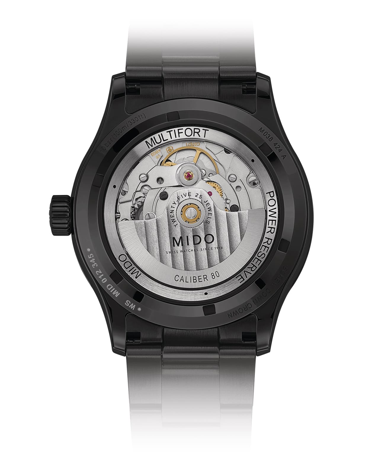 Часы MIDO Multifort Power Reserve (артикул M038.424.33.051.00) сочетают в себе спортивный и городской дизайн, подчёркивая надёжность и элегантность. Корпус диаметром 42 мм выполнен из нержавеющей стали с чёрным PVD-покрытиемPVDУльтратонкое покрытие наносится в технике вакуумного напыления, сочетает в себе нитрид титана особой прочности со слоем золота или оксида хрома. Несёт в себе декоративную или защитную функцию. и водозащитой до 10 бар (100 метров). Прозрачная задняя крышка подчёркивает изысканный механизм. Чёрный циферблат с узором «Côtes de Genève» и накладными часовыми метками оснащён покрытием Super-LumiNova®Люминесцентное покрытиеПозволяет считывать показания времени в темноте. Производители наносят на стрелки, часовые индексы, безель или поверхность циферблата светонакопительный состав, дающий холодное свечение. для отличной читаемости. Индикатор запаса хода расположен в положении «9 часов», а окошко даты — в положении «3 часа». Циферблат защищён сапфировым стекломСапфировое стеклоПрочный и надёжный материал из кристалла сапфира синтетического происхождения, характеризующийся особой твёрдостью и устойчивостью к царапинам и повреждениям. с антибликовым покрытием.