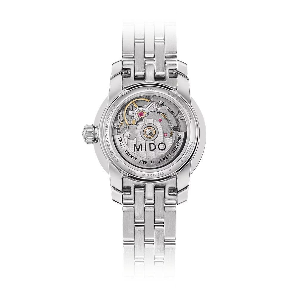 Mido Baroncelli Lady Twenty Five M039.007.11.106.00 — утончённые женские часы, созданные для тех, кто ценит изящество и швейцарскую точность. Корпус диаметром 25 мм выполнен из полированной нержавеющей стали и гармонично сочетается с пятизвенным браслетом, дополненным раскладной застёжкойРаскладная застёжкаТакой тип застёжки используется только на браслетах из металла. Она никогда не раскрывается полностью, происходит разделение на 2 и более частей. Раскладывающая застёжка снизит вероятность потери часов к минимуму.. Циферблат из натурального перламутра украшен двенадцатью бриллиантами-часовыми метками, создающими игру света и подчеркивающими утончённый характер модели. Защиту обеспечивает сапфировое стеклоСапфировое стеклоПрочный и надёжный материал из кристалла сапфира синтетического происхождения, характеризующийся особой твёрдостью и устойчивостью к царапинам и повреждениям. с надёжным антибликовым покрытиемАнтибликовое покрытиеСлой оксида металла в 0,13-0,3 микрон, благодаря которому стекло часов не бликует и не отражает свет. Антибликовое покрытие уменьшает отражение света в 10 раз, обеспечивая отличную читаемость показателей циферблата., что гарантирует отличную читаемость в любых условиях. Прозрачная задняя крышка открывает вид на тщательно декорированный ротор, что придаёт часам дополнительное очарование. Водозащита до 50 метров делает модель практичной для повседневного ношения, сохраняя при этом её ювелирную элегантность.