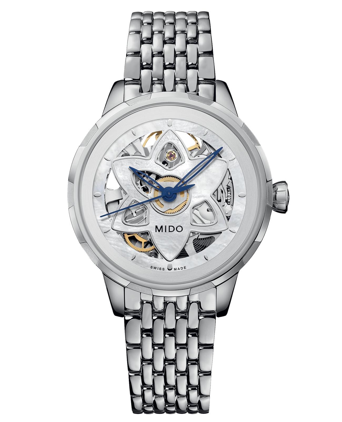 Часы MIDO Rainflower Blossom (артикул M043.236.11.101.00) представляют собой изысканное сочетание элегантности и современного дизайна, вдохновлённого формой лепестков лотоса Сингапурского музея ArtScience. Корпус диаметром 34 мм выполнен из нержавеющей стали с водозащитой до 3 бар (30 метров). Прозрачная задняя крышка открывает вид на изысканный механизм. Циферблат из белого перламутра с цветочным узором выполнен в скелетонизированном стиле, дополняется накладными часовыми метками. Циферблат защищён сапфировым стекломСапфировое стеклоПрочный и надёжный материал из кристалла сапфира синтетического происхождения, характеризующийся особой твёрдостью и устойчивостью к царапинам и повреждениям. с антибликовым покрытием.