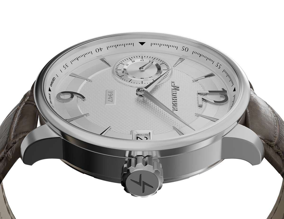 Мужские механические часы с ручным подзаводом — это аксессуар от легендарного бренда «МОЛНИЯ», созданный на Челябинском часовом заводе. Корпус диаметром 41 мм выполнен из нержавеющей стали 316L с зеркальной полировкой. Циферблат белого цвета оформлен арабскими цифрами и стальными индексами. Малая секундная стрелка вынесена на позицию 9 часов, окошко даты расположено в положении 3 часов. Циферблат защищён сапфировым стекломСапфировое стеклоПрочный и надёжный материал из кристалла сапфира синтетического происхождения, характеризующийся особой твёрдостью и устойчивостью к царапинам и повреждениям.. Механизм — мануфактурный калибр 3605, собранный вручную. Прозрачная задняя крышка позволяет наблюдать за работой механизма. Часы оснащены кожаным ремешком коричневого цвета с раскладной застёжкойРаскладная застёжкаТакой тип застёжки используется только на браслетах из металла. Она никогда не раскрывается полностью, происходит разделение на 2 и более частей. Раскладывающая застёжка снизит вероятность потери часов к минимуму. и системой быстрой замены. Водонепроницаемость 100 м позволяет использовать часы для плавания и повседневного ношения. Идеальный выбор для тех, кто ценит российское качество и традиции.