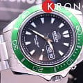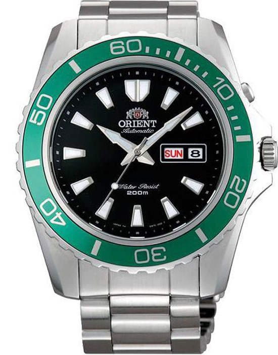 Чёрный циферблат с зелёным безелемБезельВнешний ободок, закрепляющий стекло. В спортивных часах так называется поворотное кольцо с делениями на циферблате, выполняет роль таймера – замеряет отрезки времени на шкале. Неподвижный безель – элемент декора. Однонаправленно вращающийся безель на дайверских часах позволяет фиксировать моменты погружения и выныривания на поверхность. не имеет лишних деталей. Японский автоматический калибр Orient 46943 имеет запас хода на 40 часов. Завинчивающаяся задняя крышка и заводная головка усиливают водостойкость в 200 метров. люминесцентная подсветкаЛюминесцентное покрытиеПозволяет считывать показания времени в темноте. Производители наносят на стрелки, часовые индексы, безель или поверхность циферблата светонакопительный состав, дающий холодное свечение. позволяет просматривать время и в темноте. На позиции 3 часов – окошко даты и дня недели.