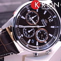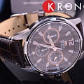 Кварцевые часы с хронографом. Часы, минуты, секунды, 12-24-х часовой формат времени. Индикация даты. Счетчик хронографа до 30 минут. Корпус выполнен из нержавеющей стали. Люминесцентные стрелки и метки. Коричневый кожаный ремешок.