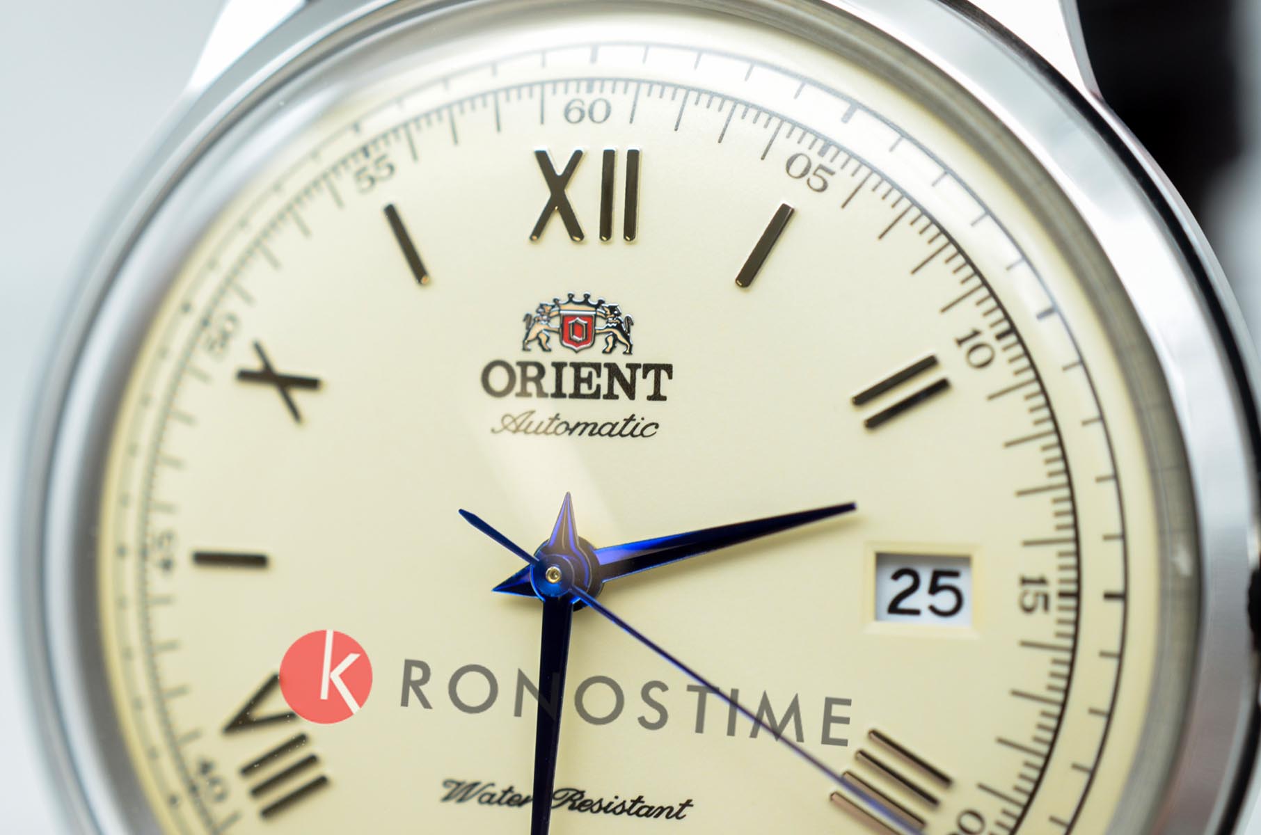 Циферблат сливочного оттенка с лёгким сатиновым блеском оформлен в классическом стиле: римские цифры, тонкие стрелки насыщенного синего цвета и небольшое окно даты у отметки «3 часа». Всё это подчёркивает сдержанную аристократичность модели.