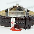 Ремешок выполнен из натуральной кожи с тиснением под крокодила и дополнен классической пряжкой. Его тёплый коричневый оттенок удачно сочетается с оттенком циферблата и добавляет образу завершённости. Водонепроницаемость — до 3 ATM, что подходит для защиты от случайных брызг и дождя.