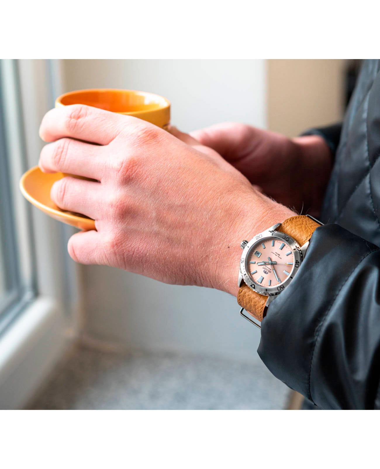 Часы оснащены кожаным ремешком шириной 20 мм на стандартной застежке. Ремешок подходит для запястий различного размера, что делает часы универсальными для большинства пользователей.