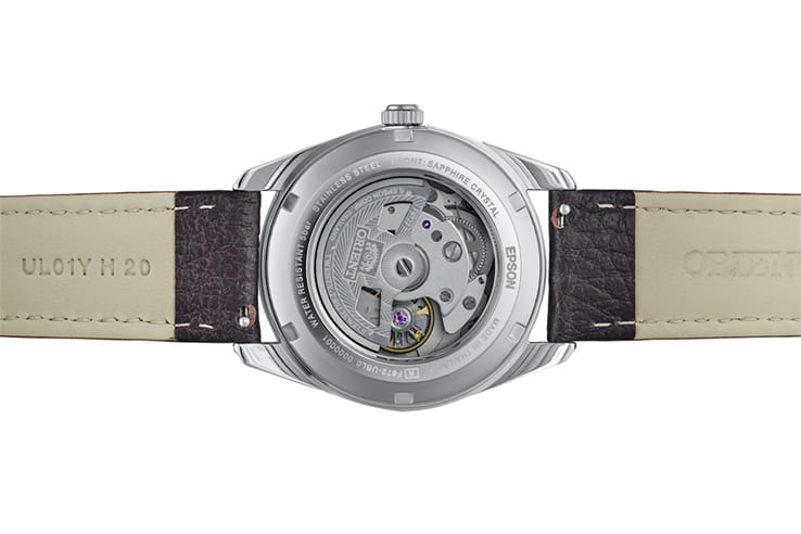 Orient Classic Automatic RA-AC0R03Y – элегантные механические часы, сочетающие классический дизайн и современные технологии. Корпус диаметром 38,5 мм выполнен из нержавеющей стали, обеспечивая долговечность и стильный внешний вид. Серебристый с лаконичными метками и стрелками защищён сапфировым стекломСапфировое стеклоПрочный и надёжный материал из кристалла сапфира синтетического происхождения, характеризующийся особой твёрдостью и устойчивостью к царапинам и повреждениям., устойчивым к царапинам. БезельБезельВнешний ободок, закрепляющий стекло. В спортивных часах так называется поворотное кольцо с делениями на циферблате, выполняет роль таймера – замеряет отрезки времени на шкале. Неподвижный безель – элемент декора. Однонаправленно вращающийся безель на дайверских часах позволяет фиксировать моменты погружения и выныривания на поверхность. с PVD-покрытиемPVDУльтратонкое покрытие наносится в технике вакуумного напыления, сочетает в себе нитрид титана особой прочности со слоем золота или оксида хрома. Несёт в себе декоративную или защитную функцию.. Часы оснащены автоматическим механизмом Orient с калибром F6722. Функциональность включает индикацию даты, расположенной в окне на отметке «3 часа». Водозащита до 50 метров (5 бар) делает модель подходящей для повседневного использования, защищая её от случайных брызг. Часы с люминесцентным покрытиемЛюминесцентное покрытиеПозволяет считывать показания времени в темноте. Производители наносят на стрелки, часовые индексы, безель или поверхность циферблата светонакопительный состав, дающий холодное свечение., обеспечивающими мгновенное считывание времени даже в темноте. Кожаный ремешок на стандартной застежке, обеспечивающей комфортное ношение и надёжную фиксацию на запястье.
