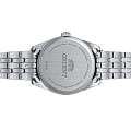 Orient RA-WG0602L — женская кварцевая модель из коллекции Contemporary с элегантным и сдержанным дизайном. Корпус диаметром 32,1 мм выполнен из нержавеющей стали, создающим изысканный акцент. Синий циферблат украшен тонкими метками и стрелками, обеспечивающими лёгкую читаемость, а апертура даты расположена в позиции «3 часа». Защитную функцию выполняет минеральное стеклоМинеральное стеклоМинеральное стекло представляет собой искусственно выращенный минерал кварца. Такое стекло отличается особой устойчивостью к повреждениям и царапинам. Уступает по некоторым качествам сапфировому стеклу., стойкое к повседневным повреждениям. Часы работают на точном кварцевом механизме на солнечной энергии, не требующем подзавода. Водозащита составляет 5 бар (50 м), что защищает модель от брызг и дождя. Браслет из нержавеющей стали гармонично завершает образ, подчеркивая классический стиль и универсальность этих часов.