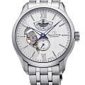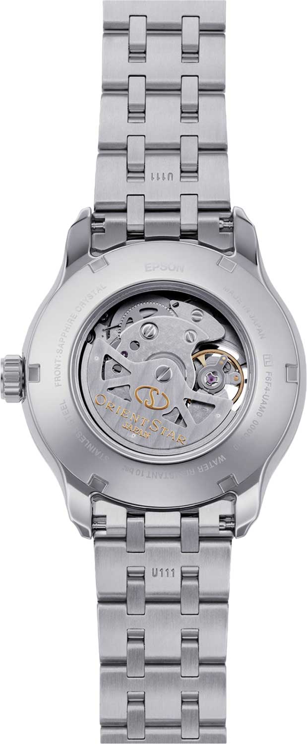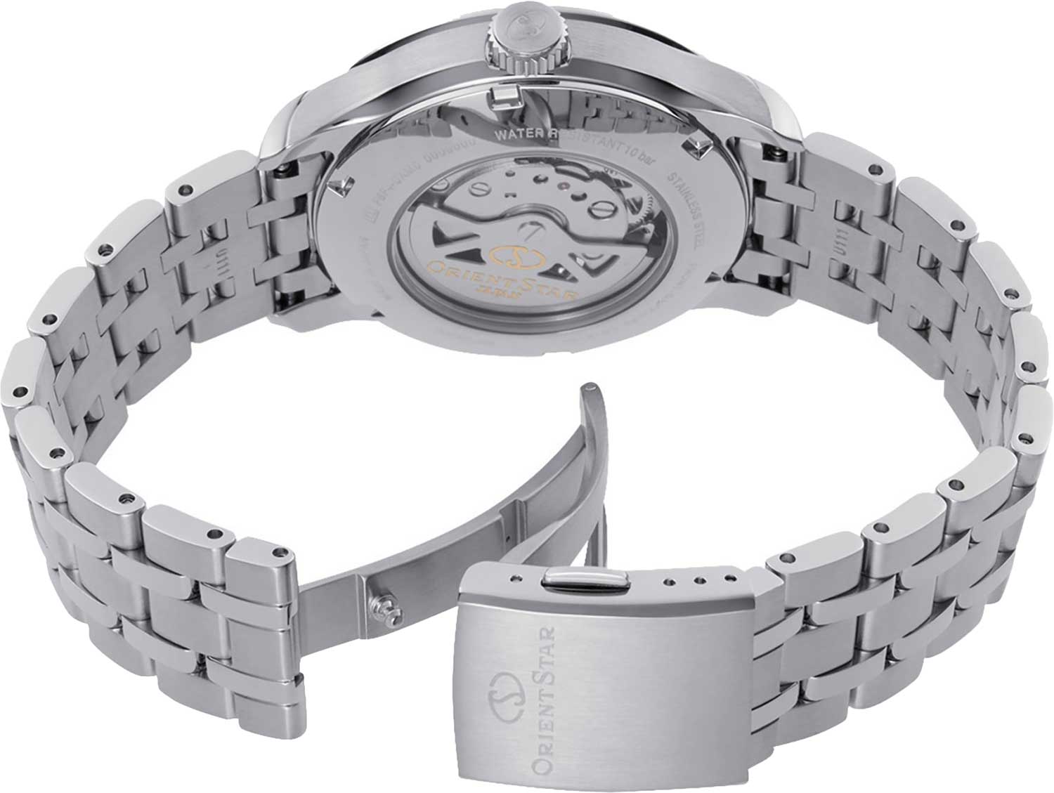 Часы Orient Star RK-AV0B01S — это мужская модель, которая сочетает в себе современный дизайн и передовые технологии. Корпус выполнен из нержавеющей стали, имеет круглую форму с диаметром 41 мм и толщиной 13,6 мм. Часы оснащены белым циферблатом с уникальным двухслойным дизайном, где верхний слой выполнен в виде узора «елочка», а нижний — с узором «пейсли», что создает эффект глубины и текстуры, напоминающей ткань костюма. Защита циферблата обеспечивается сапфировым стекломСапфировое стеклоПрочный и надёжный материал из кристалла сапфира синтетического происхождения, характеризующийся особой твёрдостью и устойчивостью к царапинам и повреждениям. с антибликовым покрытиемАнтибликовое покрытиеСлой оксида металла в 0,13-0,3 микрон, благодаря которому стекло часов не бликует и не отражает свет. Антибликовое покрытие уменьшает отражение света в 10 раз, обеспечивая отличную читаемость показателей циферблата., что повышает читаемость и устойчивость к царапинам. Модель работает на автоматическом механизме Caliber F6F44, который поддерживает как автоподзавод, так и ручной завод. Точность хода составляет от +25 до -15 секунд в сутки, а запас хода достигает 50 часов. Это делает часы удобными для повседневного использования без необходимости частой подзарядки. Механизм также оснащен функцией остановки секундной стрелки, что позволяет точно выставлять время. Функционал часов включает индикатор запаса хода, расположенный на 12 часах, который отображает оставшийся запас энергии механизма. Это полезная функция для контроля состояния часов. На циферблате также расположено полупрозрачное окно в форме узора «пейсли», через которое частично видна работа механизма, что добавляет визуальной привлекательности. Стрелки и индексы покрыты люминесцентным напылениемЛюминесцентное покрытиеПозволяет считывать показания времени в темноте. Производители наносят на стрелки, часовые индексы, безель или поверхность циферблата светонакопительный состав, дающий холодное свечение., что обеспечивает хорошую видимость в условиях слабого освещения. Часы обладают водонепроницаемостью до 100 метров (10 бар), что делает их подходящими для плавания и других активных видов деятельности. Задняя крышка корпуса выполнена с прозрачным окном, что позволяет наблюдать за работой механизма. Браслет выполнен из нержавеющей стали и оснащен раскладной застежкойРаскладная застёжкаТакой тип застёжки используется только на браслетах из металла. Она никогда не раскрывается полностью, происходит разделение на 2 и более частей. Раскладывающая застёжка снизит вероятность потери часов к минимуму., которая обеспечивает удобство и надежность при ношении.