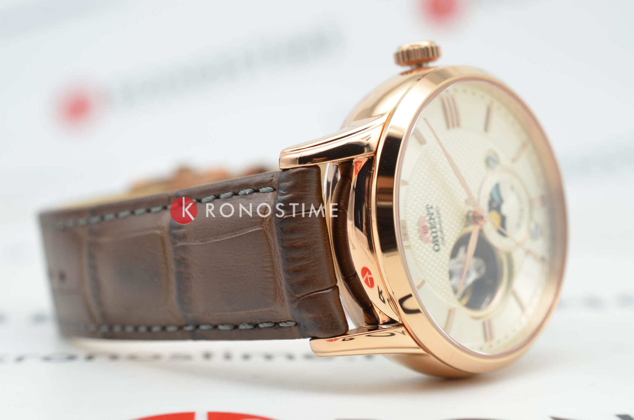 Часы Orient RA-AS0002S представляют собой модель из коллекции Classic, сочетающую в себе классический дизайн и современные технологии. Это мужские механические часы с автоподзаводом, оснащённые калибром F6L24, который обеспечивает точность хода в пределах +25/-15 секунд в сутки и запас хода до 40 часов. Часы также поддерживают функцию ручного подзавода и остановки секундной стрелки (hacking stop), что позволяет точно синхронизировать время. Корпус часов выполнен из нержавеющей стали с PVD-покрытиемPVDУльтратонкое покрытие наносится в технике вакуумного напыления, сочетает в себе нитрид титана особой прочности со слоем золота или оксида хрома. Несёт в себе декоративную или защитную функцию., что придаёт ему дополнительную износостойкость и элегантный внешний вид. Диаметр корпуса составляет 42 мм при толщине 14 мм. Водонепроницаемость модели достигает 50 метров, что защищает часы от случайных брызг или капель дождя, но не предназначено для плавания или дайвинга. Часы оснащены сапфировым стекломСапфировое стеклоПрочный и надёжный материал из кристалла сапфира синтетического происхождения, характеризующийся особой твёрдостью и устойчивостью к царапинам и повреждениям., устойчивым к царапинам, и винтовой задней крышкой с прозрачным окном, позволяющим наблюдать за работой механизма. Циферблат выполнен в бежевом цвете с уникальным дизайном, включающим индикацию солнца и луны (Sun & Moon), что добавляет часам уникальный и стильный вид. Ремешок часов изготовлен из коричневой кожи, что придаёт часам классический и элегантный вид. Застёжка выполнена в виде раскладной застежкиРаскладная застёжкаТакой тип застёжки используется только на браслетах из металла. Она никогда не раскрывается полностью, происходит разделение на 2 и более частей. Раскладывающая застёжка снизит вероятность потери часов к минимуму., которая обеспечивает удобство и надёжную фиксацию на запястье.