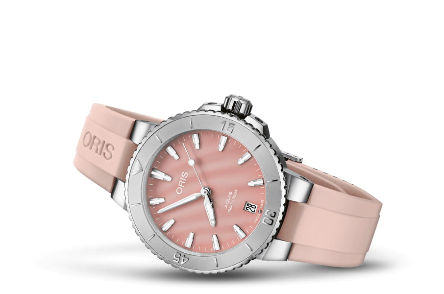 Румяно-розовые дайверские часы Aquis Date выделяются контрастным циферблатом. Циферблат, выполненный из перламутра, переливается, как закат на воде, придавая элегантность высокопроизводительным часам. Эти часы со знакомым коническим силуэтом - уникальный экземпляр в коллекции Aquis.