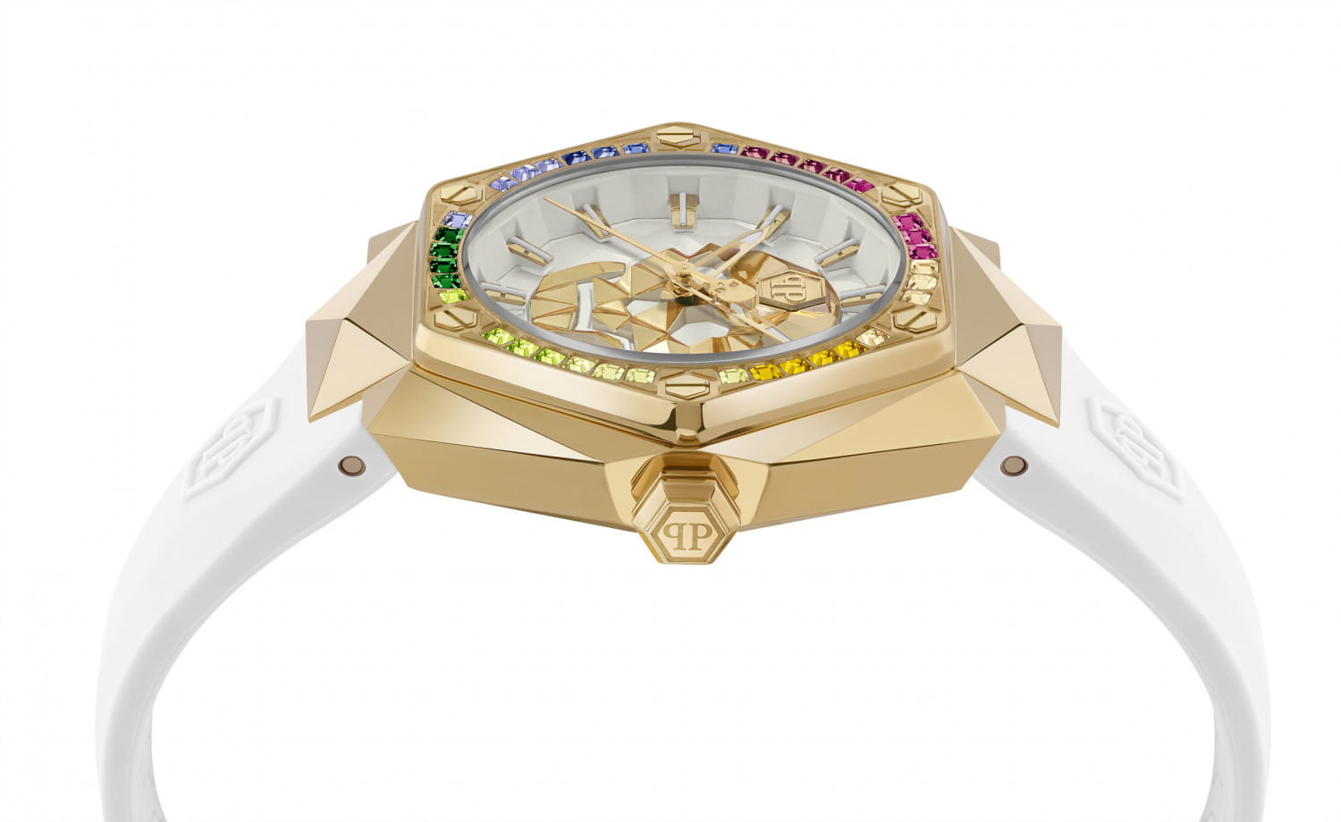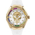 Стальной корпус с золотым IP-покрытиемIP-покрытиеМетод ионного напыления. Демонстрирует повышенную устойчивость к истиранию, окислению и химическим веществам. Под воздействием высокого давления и температуры около 1500°C молекулы металла надёжно соединяются с частицами корпуса часов.. БезельБезельВнешний ободок, закрепляющий стекло. В спортивных часах так называется поворотное кольцо с делениями на циферблате, выполняет роль таймера – замеряет отрезки времени на шкале. Неподвижный безель – элемент декора. Однонаправленно вращающийся безель на дайверских часах позволяет фиксировать моменты погружения и выныривания на поверхность. украшен шестиугольными логотипами бренда, расположенными симметрично слева и справа, сверху украшен символичным логотипом Philipp Plein, а снизу украшен названием коллекции ''The Skull''. Метки в виде штрихов.