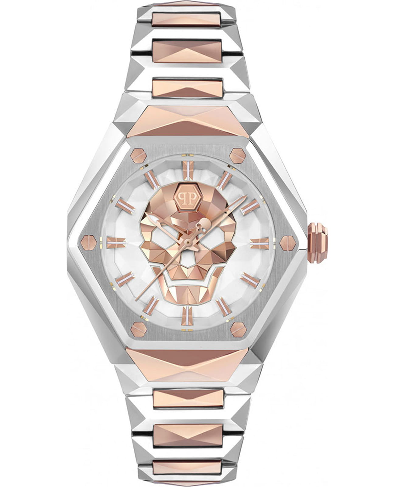 Часы Philipp Plein PWADA0624 из коллекции Skull Spikes — это женская модель, сочетающая смелый дизайн и высокое качество исполнения. Корпус диаметром 40 мм выполнен из нержавеющей стали, что придаёт часам элегантный и современный вид. Белый циферблат украшен фирменным мотивом черепа и защищён минеральным стекломМинеральное стеклоМинеральное стекло представляет собой искусственно выращенный минерал кварца. Такое стекло отличается особой устойчивостью к повреждениям и царапинам. Уступает по некоторым качествам сапфировому стеклу., устойчивым к царапинам.