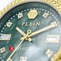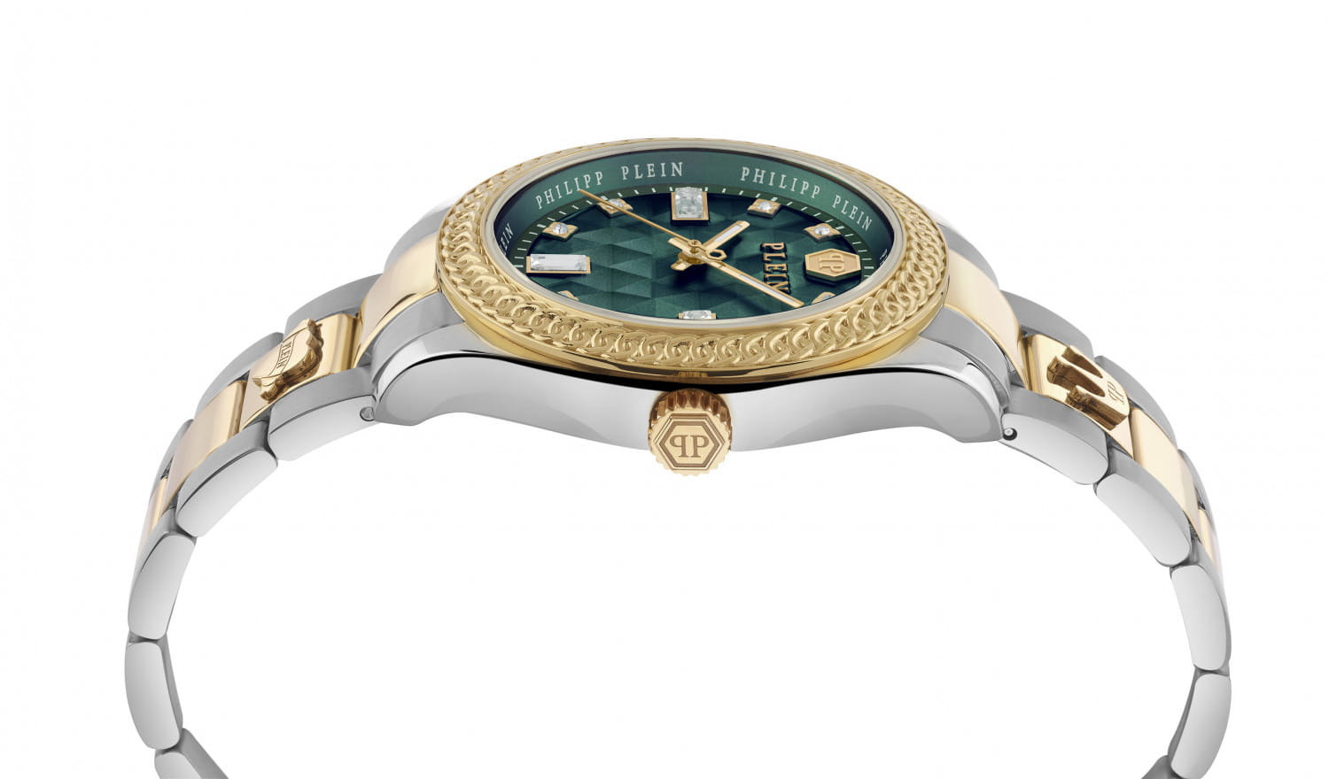 Часы Philipp Plein PWCDA0524 из коллекции Queen сочетают элегантность и функциональность. Корпус диаметром 38 мм выполнен из нержавеющей стали, придающим изделию роскошный вид. Зеленый циферблат украшен фирменным логотипом бренда в виде черепа на отметке 12 часов. БезельБезельВнешний ободок, закрепляющий стекло. В спортивных часах так называется поворотное кольцо с делениями на циферблате, выполняет роль таймера – замеряет отрезки времени на шкале. Неподвижный безель – элемент декора. Однонаправленно вращающийся безель на дайверских часах позволяет фиксировать моменты погружения и выныривания на поверхность. с IP-покрытиемIP-покрытиеМетод ионного напыления. Демонстрирует повышенную устойчивость к истиранию, окислению и химическим веществам. Под воздействием высокого давления и температуры около 1500°C молекулы металла надёжно соединяются с частицами корпуса часов..