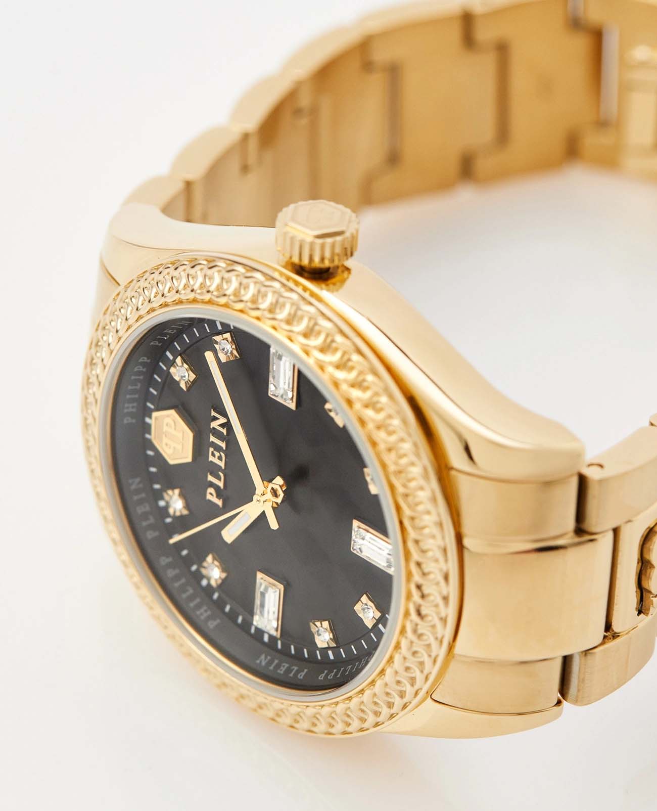 ​​Часы Philipp Plein PWCDA0624 из коллекции Queen сочетают элегантность и функциональность.​​ ​​Корпус диаметром 38 мм выполнен из нержавеющей стали с PVD-покрытиемPVDУльтратонкое покрытие наносится в технике вакуумного напыления, сочетает в себе нитрид титана особой прочности со слоем золота или оксида хрома. Несёт в себе декоративную или защитную функцию., придающим изделию роскошный вид.​​ ​БезельБезельВнешний ободок, закрепляющий стекло. В спортивных часах так называется поворотное кольцо с делениями на циферблате, выполняет роль таймера – замеряет отрезки времени на шкале. Неподвижный безель – элемент декора. Однонаправленно вращающийся безель на дайверских часах позволяет фиксировать моменты погружения и выныривания на поверхность. с PVD-покрытиемPVDУльтратонкое покрытие наносится в технике вакуумного напыления, сочетает в себе нитрид титана особой прочности со слоем золота или оксида хрома. Несёт в себе декоративную или защитную функцию..