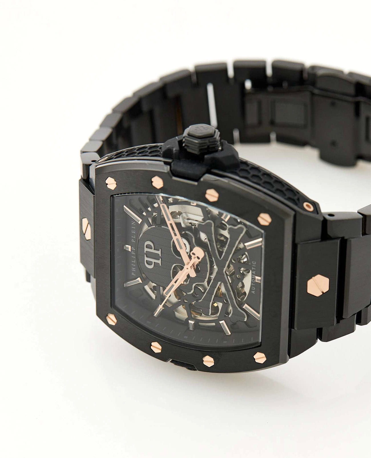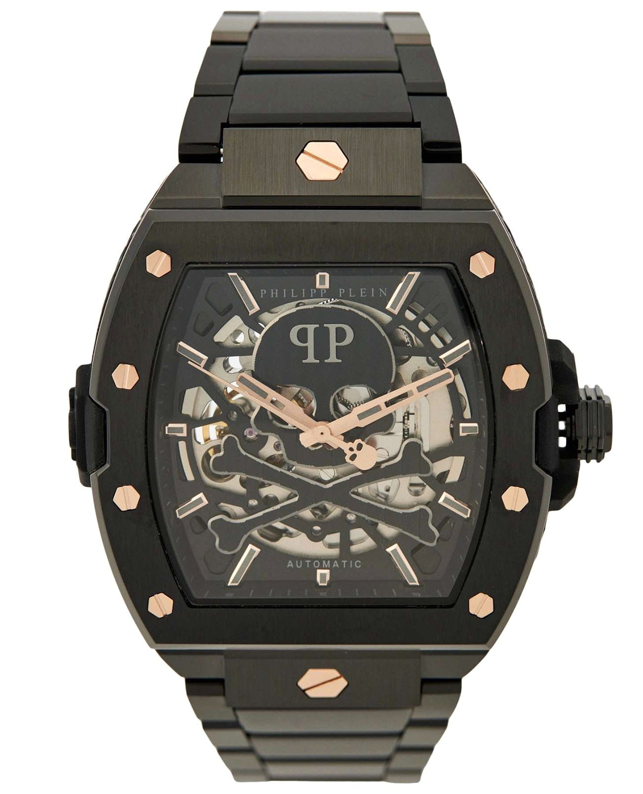 Philipp Plein The $keleton 2.0 PWJFA0725 - это дерзкие и бескомпромиссные часы, воплощающие бунтарский дух бренда. Их отличает узнаваемый мотив черепа, ставший визитной карточкой Philipp Plein, искусно интегрированный в дизайн циферблата. Скелетонизированные мужские механические часы с автоподзаводом. Бочкообразный стальной корпус диаметром 44 мм с PVD-покрытиемPVDУльтратонкое покрытие наносится в технике вакуумного напыления, сочетает в себе нитрид титана особой прочности со слоем золота или оксида хрома. Несёт в себе декоративную или защитную функцию.. Стальной браслет на застёжке-бабочке с кнопкамиЗастёжка "бабочка"Такой вид застёжки дополняется предохранителями, помогающими избежать случайного раскрытия браслета. Обладают изящным исполнением. обеспечивает надёжную фиксацию и комфортное ношение. Метки в виде точек. Минеральное стеклоМинеральное стеклоМинеральное стекло представляет собой искусственно выращенный минерал кварца. Такое стекло отличается особой устойчивостью к повреждениям и царапинам. Уступает по некоторым качествам сапфировому стеклу. защищает циферблат от царапин. Люминесцентное покрытиеЛюминесцентное покрытиеПозволяет считывать показания времени в темноте. Производители наносят на стрелки, часовые индексы, безель или поверхность циферблата светонакопительный состав, дающий холодное свечение. стрелок и меток позволит следить за временем даже в полной темноте. Граненая заводная головка. Влагозащита: 50 метров, позволит защитить корпус от случайных брызг или капель дождя. Идеальный аксессуар для тех, кто ценит индивидуальность и не боится выделяться из толпы.