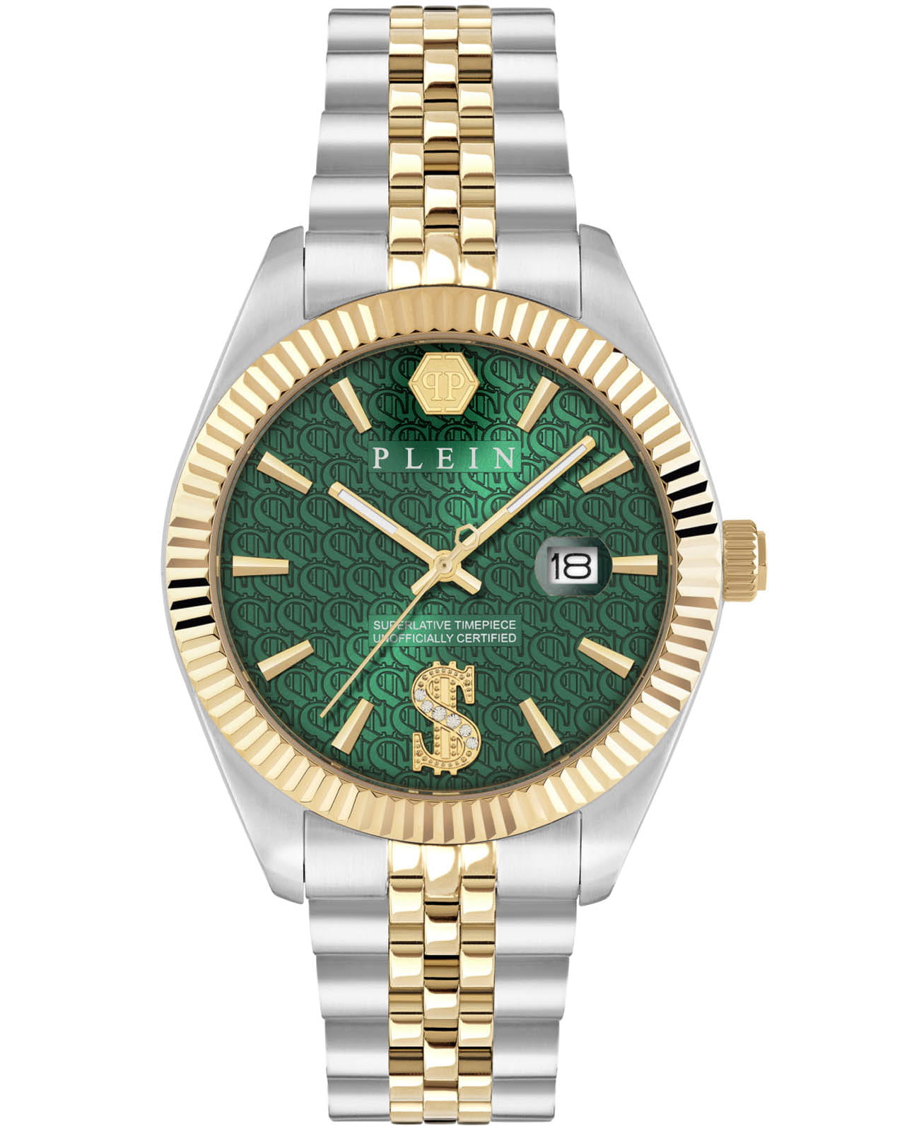 Philipp Plein Date Superlative PWMFA0825 - часы в современном дизайне несомненно добавят вам выразительности и станут главным акцентом вашего стильного образа. Мужские кварцевые часы с высокой точностью. Круглый стальной корпус серебристого цвета, диаметром 41 мм. Циферблат декорирован логотипом бренда в положении 12 часов, метки в виде штрихов. Минеральное стеклоМинеральное стеклоМинеральное стекло представляет собой искусственно выращенный минерал кварца. Такое стекло отличается особой устойчивостью к повреждениям и царапинам. Уступает по некоторым качествам сапфировому стеклу. защищает циферблат от царапин. Люминесцентное покрытиеЛюминесцентное покрытиеПозволяет считывать показания времени в темноте. Производители наносят на стрелки, часовые индексы, безель или поверхность циферблата светонакопительный состав, дающий холодное свечение. стрелок позволит следить за временем даже в полной темноте. Рифленый безельБезельВнешний ободок, закрепляющий стекло. В спортивных часах так называется поворотное кольцо с делениями на циферблате, выполняет роль таймера – замеряет отрезки времени на шкале. Неподвижный безель – элемент декора. Однонаправленно вращающийся безель на дайверских часах позволяет фиксировать моменты погружения и выныривания на поверхность. с PVD-покрытиемPVDУльтратонкое покрытие наносится в технике вакуумного напыления, сочетает в себе нитрид титана особой прочности со слоем золота или оксида хрома. Несёт в себе декоративную или защитную функцию. золотистого цвета. Окошко даты находится в положении 3 часа. Стальной браслет с частичным PVD-покрытиемPVDУльтратонкое покрытие наносится в технике вакуумного напыления, сочетает в себе нитрид титана особой прочности со слоем золота или оксида хрома. Несёт в себе декоративную или защитную функцию. на застёжке-бабочке с кнопкамиЗастёжка "бабочка"Такой вид застёжки дополняется предохранителями, помогающими избежать случайного раскрытия браслета. Обладают изящным исполнением. , обеспечивает комфортное ношение. Граненая заводная головка. Влагозащита: 50 метров, позволит защитить корпус от случайных брызг или капель дождя. Идеальный аксессуар для тех, кто ценит индивидуальность и не боится выделяться из толпы.