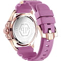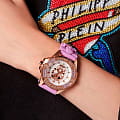 Яркие женские часы с минеральным стекломМинеральное стеклоМинеральное стекло представляет собой искусственно выращенный минерал кварца. Такое стекло отличается особой устойчивостью к повреждениям и царапинам. Уступает по некоторым качествам сапфировому стеклу. Philipp Plein The Skull PWNAA0222, кварцевый механизм с высокой точностью. Класс водозащиты: 50 метров, позволит защитить корпус от случайных брызг или капель дождя. Корпус часов изготовлен из стали с IP-покрытиемIP-покрытиеМетод ионного напыления. Демонстрирует повышенную устойчивость к истиранию, окислению и химическим веществам. Под воздействием высокого давления и температуры около 1500°C молекулы металла надёжно соединяются с частицами корпуса часов.. Круглый стальной корпус украшен кристаллами Swarovski. Циферблат с метками в виде точек украшенных кристаллами Swarovski, дополнен трехмерным граненым черепом. Шестигранная заводная головка с защитой. Силиконовый ремешок украшен объемным черепом и стальной вставкой.