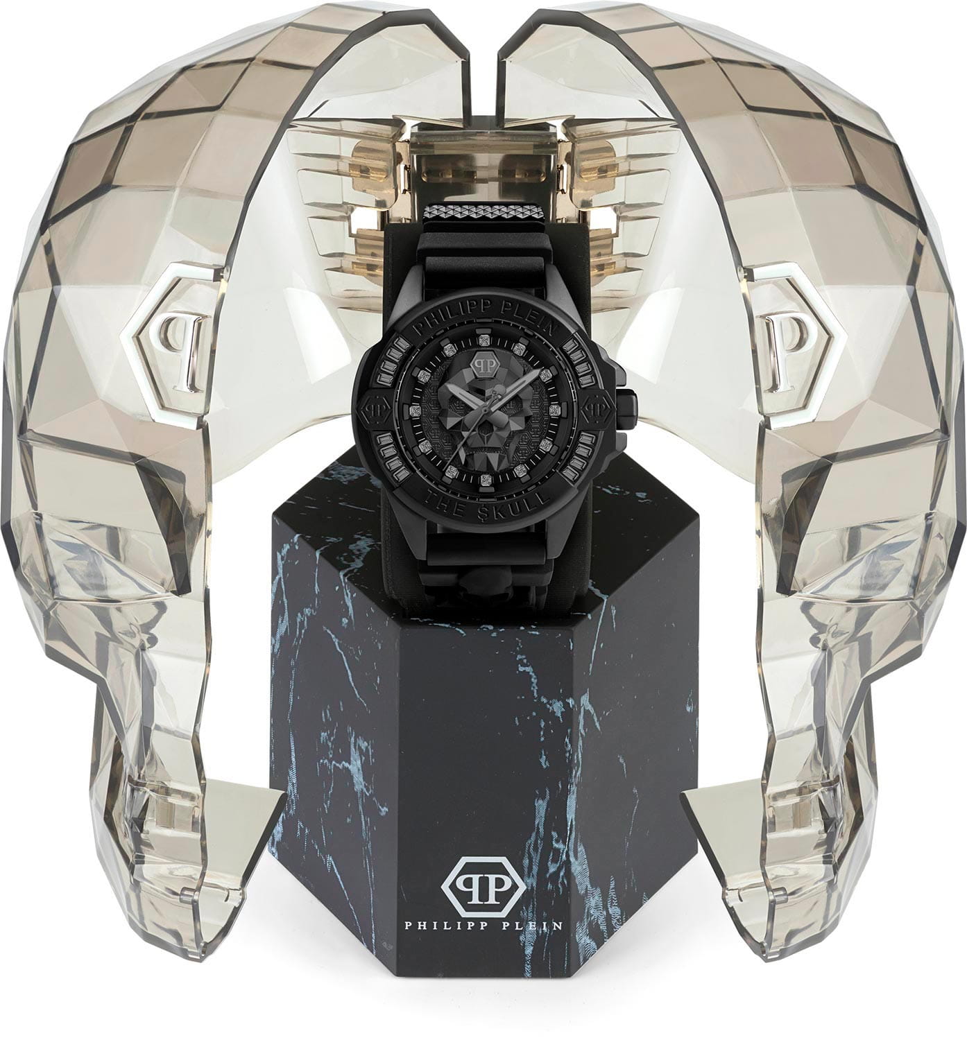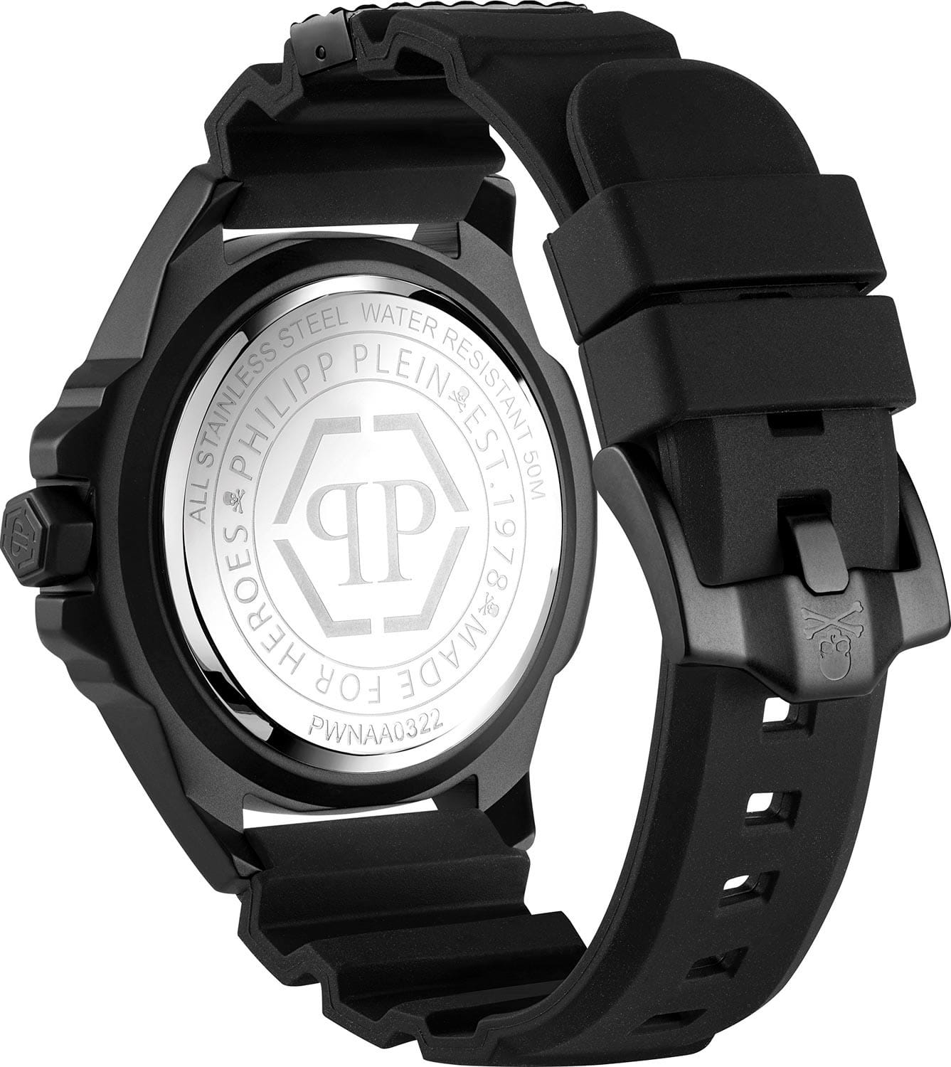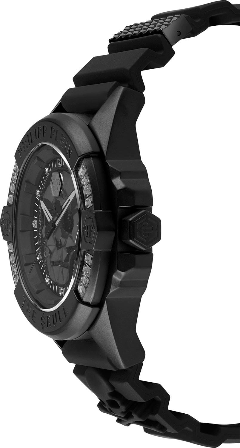 Яркие унисекс часы с минеральным стекломМинеральное стеклоМинеральное стекло представляет собой искусственно выращенный минерал кварца. Такое стекло отличается особой устойчивостью к повреждениям и царапинам. Уступает по некоторым качествам сапфировому стеклу. Philipp Plein The Skull PWNAA0322, кварцевый механизм с высокой точностью. Класс водозащиты: 50 метров, позволит защитить корпус от случайных брызг или капель дождя. Корпус часов изготовлен из стали с IP-покрытиемIP-покрытиеМетод ионного напыления. Демонстрирует повышенную устойчивость к истиранию, окислению и химическим веществам. Под воздействием высокого давления и температуры около 1500°C молекулы металла надёжно соединяются с частицами корпуса часов.. Круглый стальной корпус украшен кристаллами Swarovski. Циферблат с метками в виде точек украшенных кристаллами Swarovski, дополнен трехмерным граненым черепом. Шестигранная заводная головка с защитой. Силиконовый ремешок украшен объемным черепом и стальной вставкой.