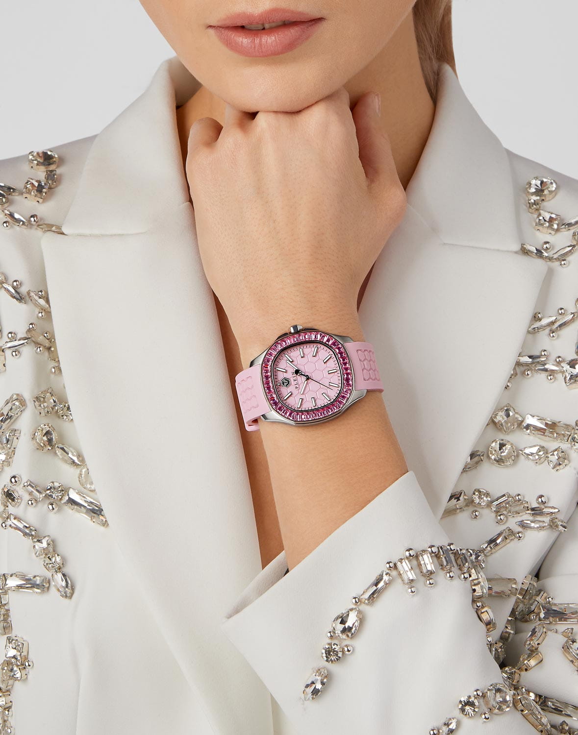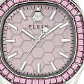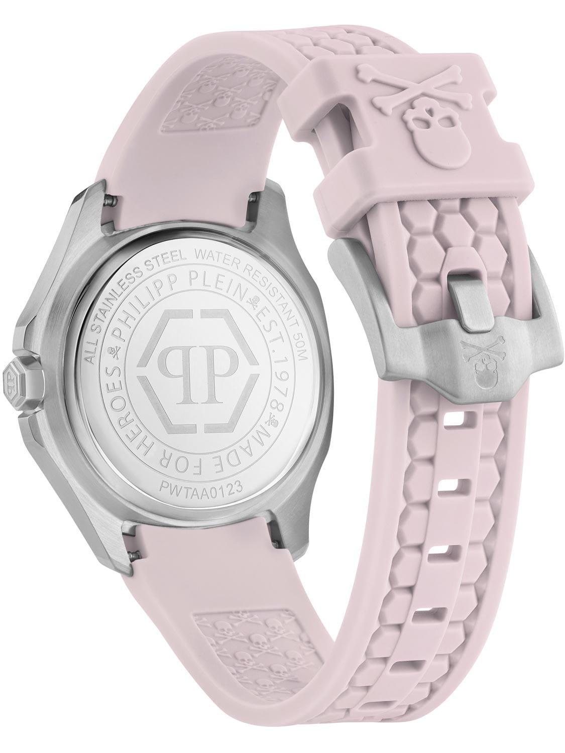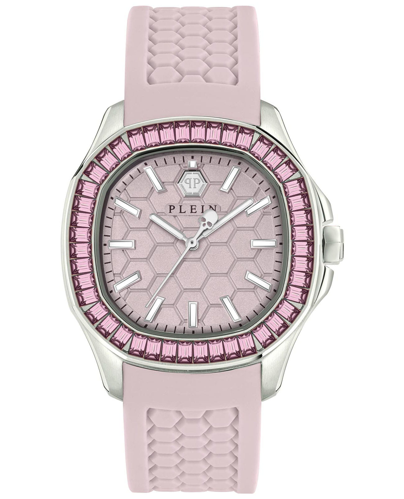 Кварцевые женские часы с минеральным стекломМинеральное стеклоМинеральное стекло представляет собой искусственно выращенный минерал кварца. Такое стекло отличается особой устойчивостью к повреждениям и царапинам. Уступает по некоторым качествам сапфировому стеклу. Philipp Plein Plein Philipp PWTAA0123, кварцевый механизм с высокой точностью. Класс водозащиты: 50 метров, позволит защитить корпус от случайных брызг или капель дождя. Корпус часов изготовлен из стали. Стрелки и метки с люминесцентным покрытиемЛюминесцентное покрытиеПозволяет считывать показания времени в темноте. Производители наносят на стрелки, часовые индексы, безель или поверхность циферблата светонакопительный состав, дающий холодное свечение.. Стальной корпус с геометричным безелемБезельВнешний ободок, закрепляющий стекло. В спортивных часах так называется поворотное кольцо с делениями на циферблате, выполняет роль таймера – замеряет отрезки времени на шкале. Неподвижный безель – элемент декора. Однонаправленно вращающийся безель на дайверских часах позволяет фиксировать моменты погружения и выныривания на поверхность., инкрустированным кристаллами. Силиконовый ремешок с шестиугольным рисунком на стандартной застёжке, украшенной черепом.
